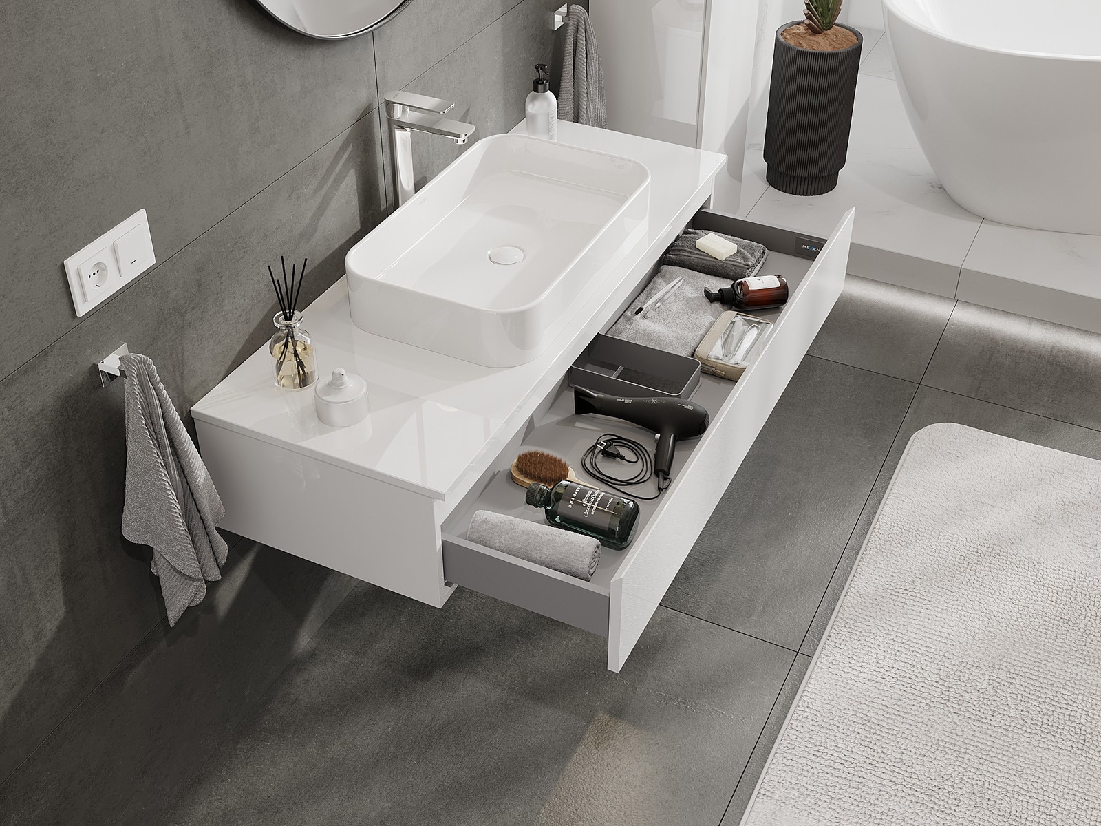 Výrez v zásuvke je navrhnutý tak, aby pojal sifón, ktorý je nevyhnutný v umývadlových inštaláciách. Vďaka tomu môže byť nábytok namontovaný plne funkčne, bez nutnosti vzdávať sa priestoru v zásuvke v prospech inštalácie.