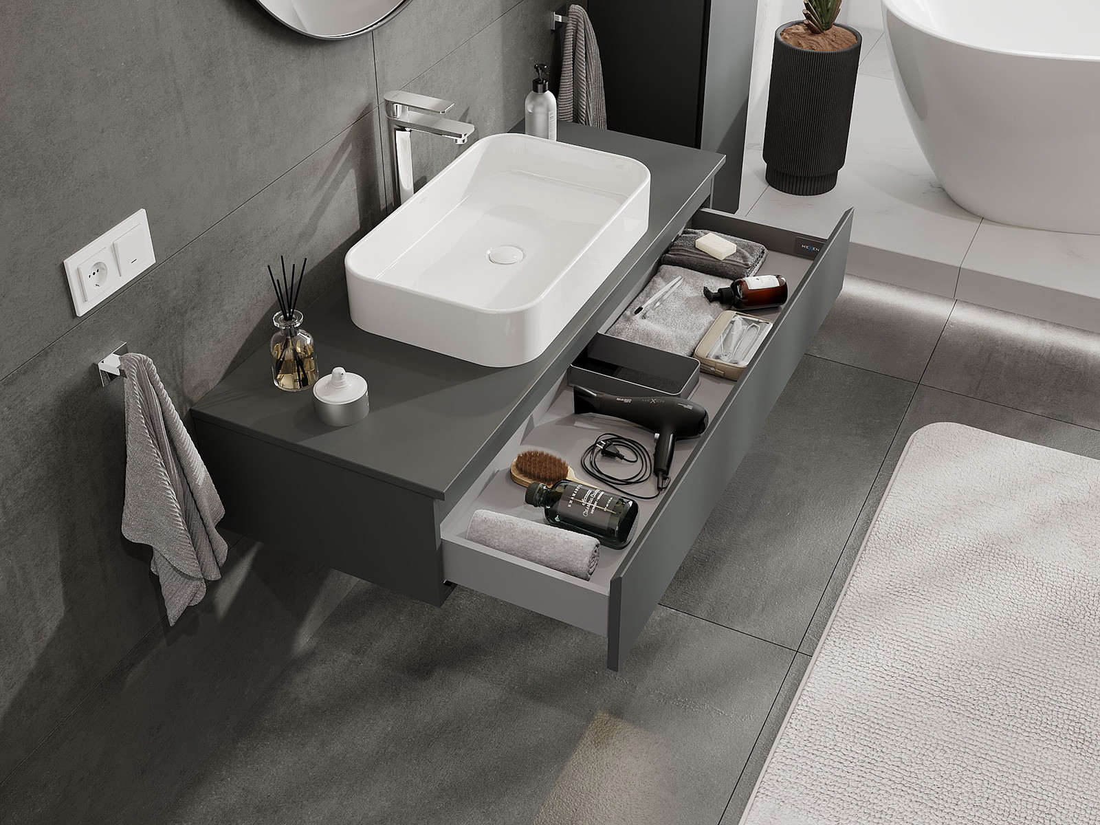 Výrez v zásuvke je navrhnutý tak, aby pojal sifón, ktorý je nevyhnutný v umývadlových inštaláciách. Vďaka tomu môže byť nábytok namontovaný plne funkčne, bez nutnosti vzdávať sa priestoru v zásuvke v prospech inštalácie.