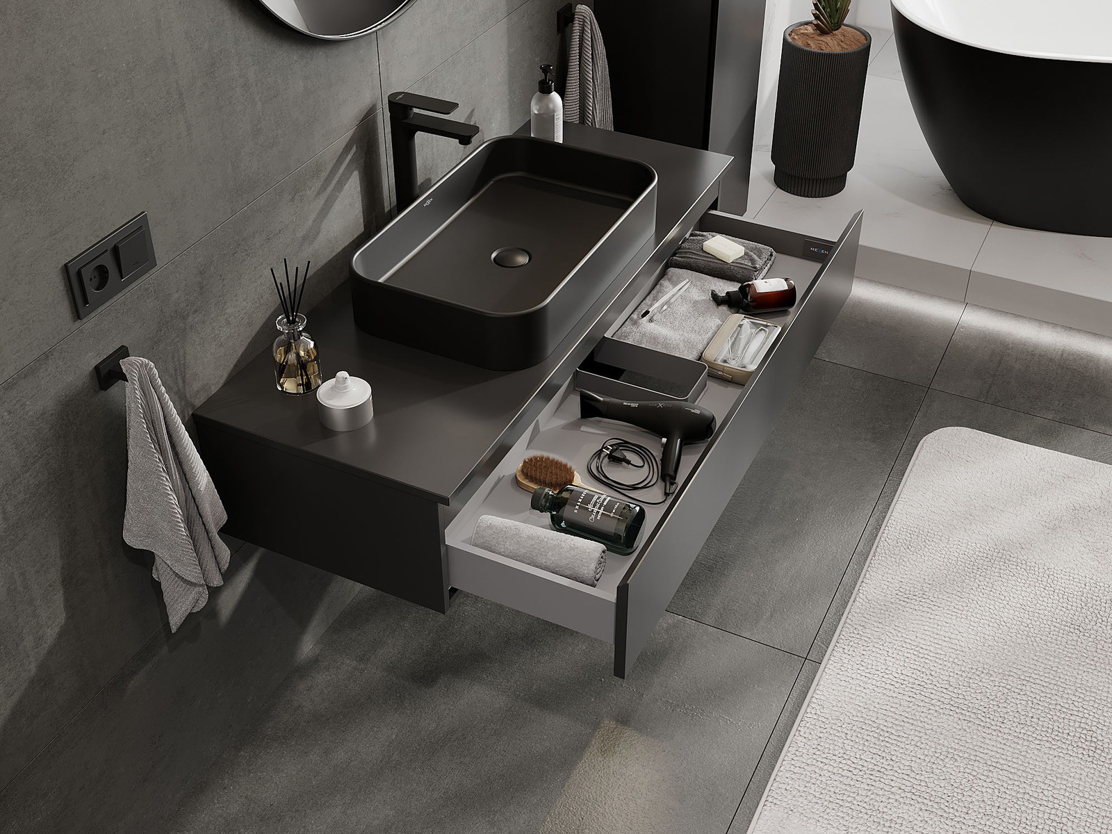 Výrez v zásuvke je navrhnutý tak, aby pojal sifón, ktorý je nevyhnutný v umývadlových inštaláciách. Vďaka tomu môže byť nábytok namontovaný plne funkčne, bez nutnosti vzdávať sa priestoru v zásuvke v prospech inštalácie.