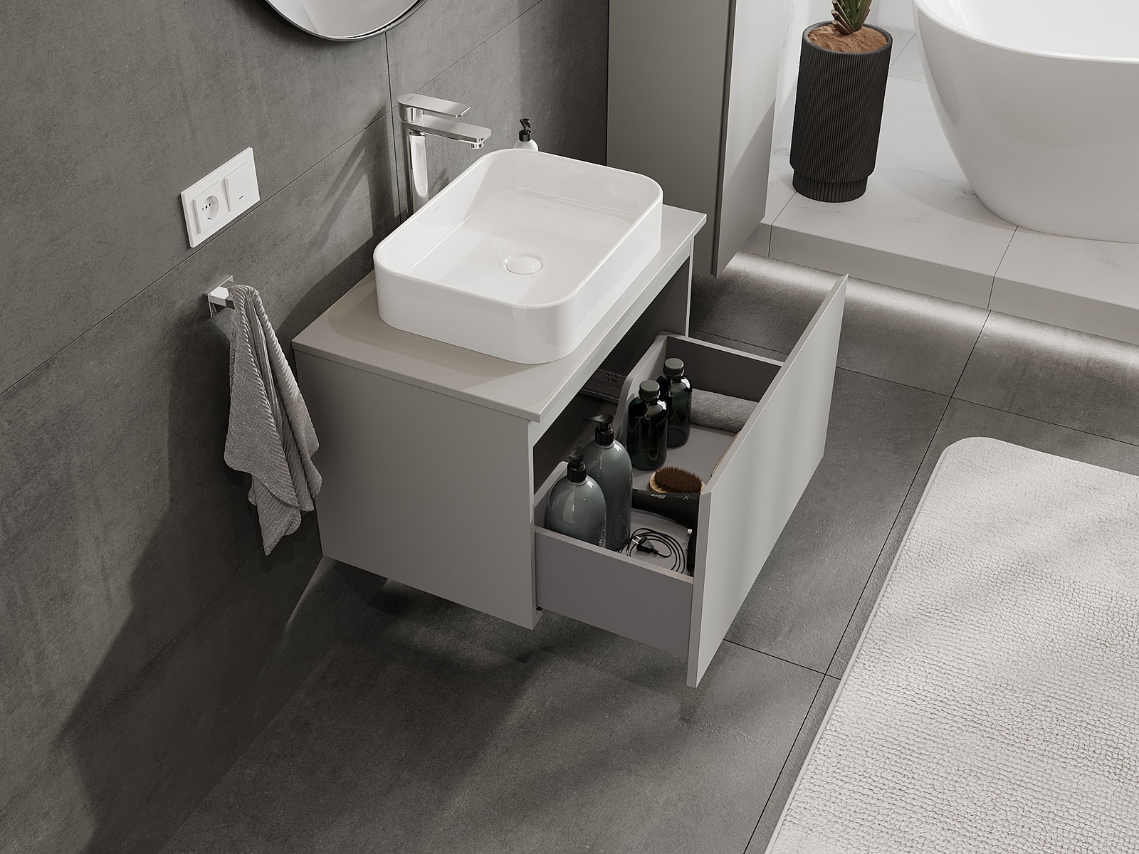 Výrez v zásuvke je navrhnutý tak, aby pojal sifón, ktorý je nevyhnutný v umývadlových inštaláciách. Vďaka tomu môže byť nábytok namontovaný plne funkčne, bez nutnosti vzdávať sa priestoru v zásuvke v prospech inštalácie.