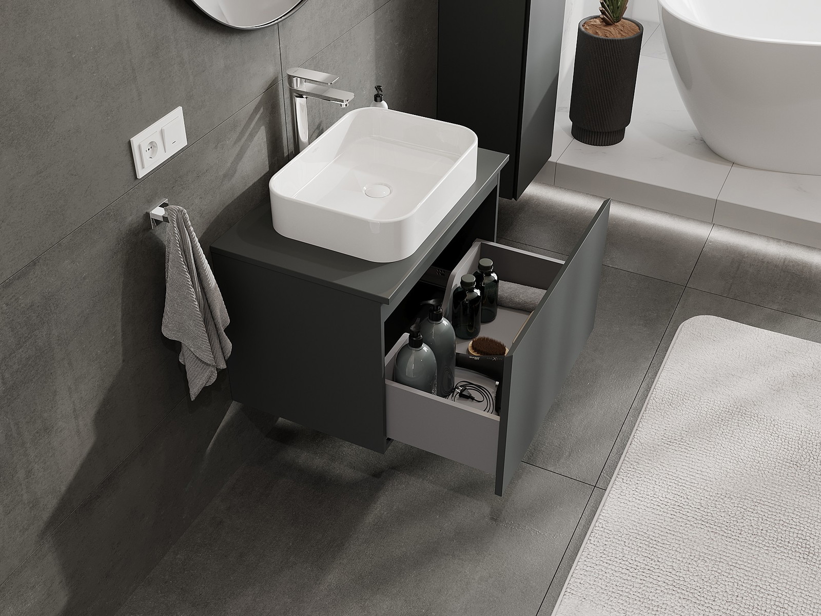 Výrez v zásuvke je navrhnutý tak, aby pojal sifón, ktorý je nevyhnutný v umývadlových inštaláciách. Vďaka tomu môže byť nábytok namontovaný plne funkčne, bez nutnosti vzdávať sa priestoru v zásuvke v prospech inštalácie.