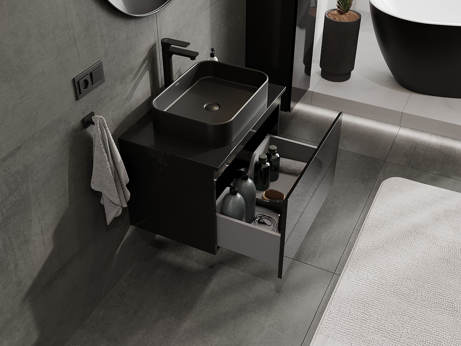 Výrez v zásuvke je navrhnutý tak, aby pojal sifón, ktorý je nevyhnutný v umývadlových inštaláciách. Vďaka tomu môže byť nábytok namontovaný plne funkčne, bez nutnosti vzdávať sa priestoru v zásuvke v prospech inštalácie.
