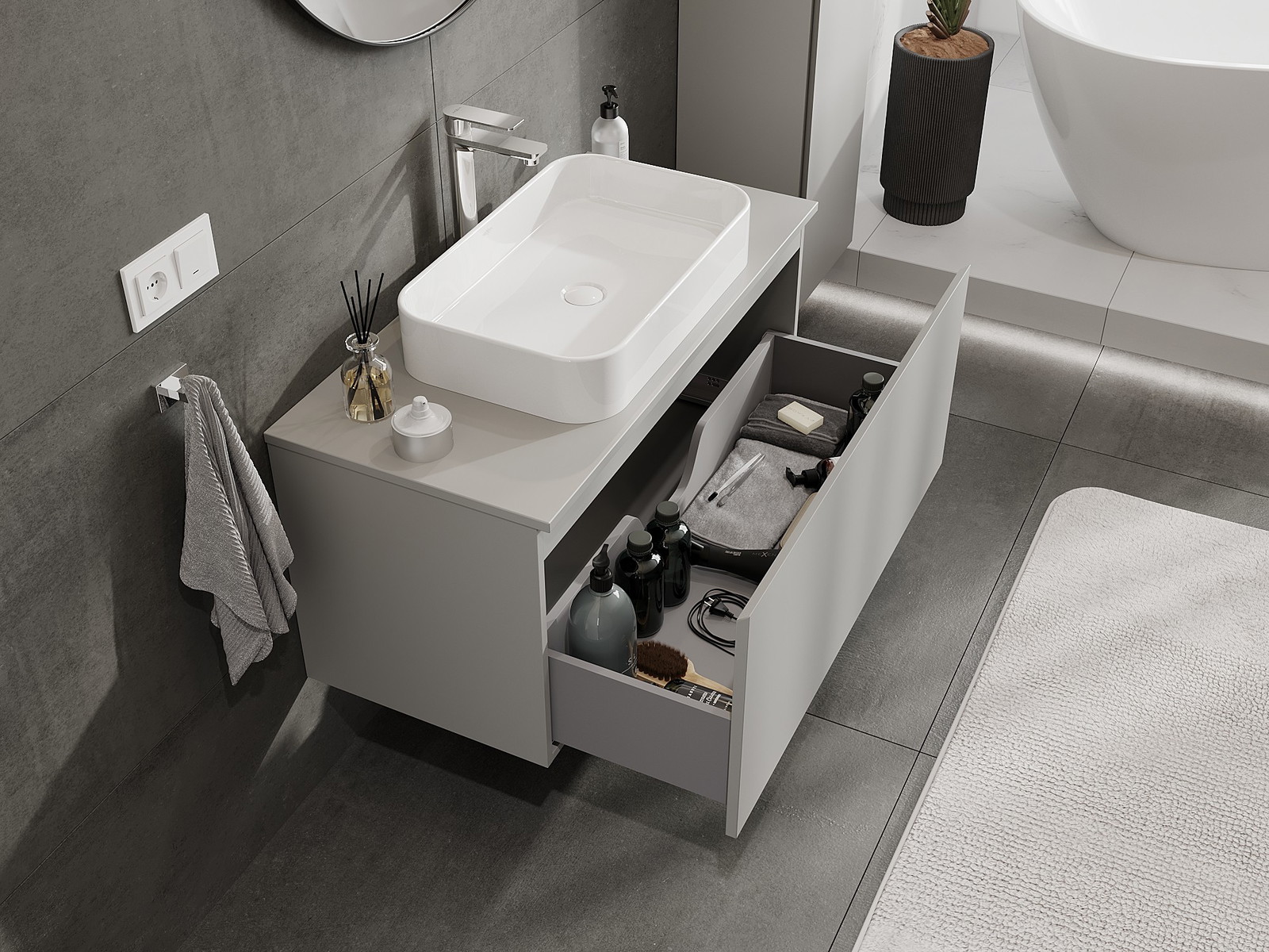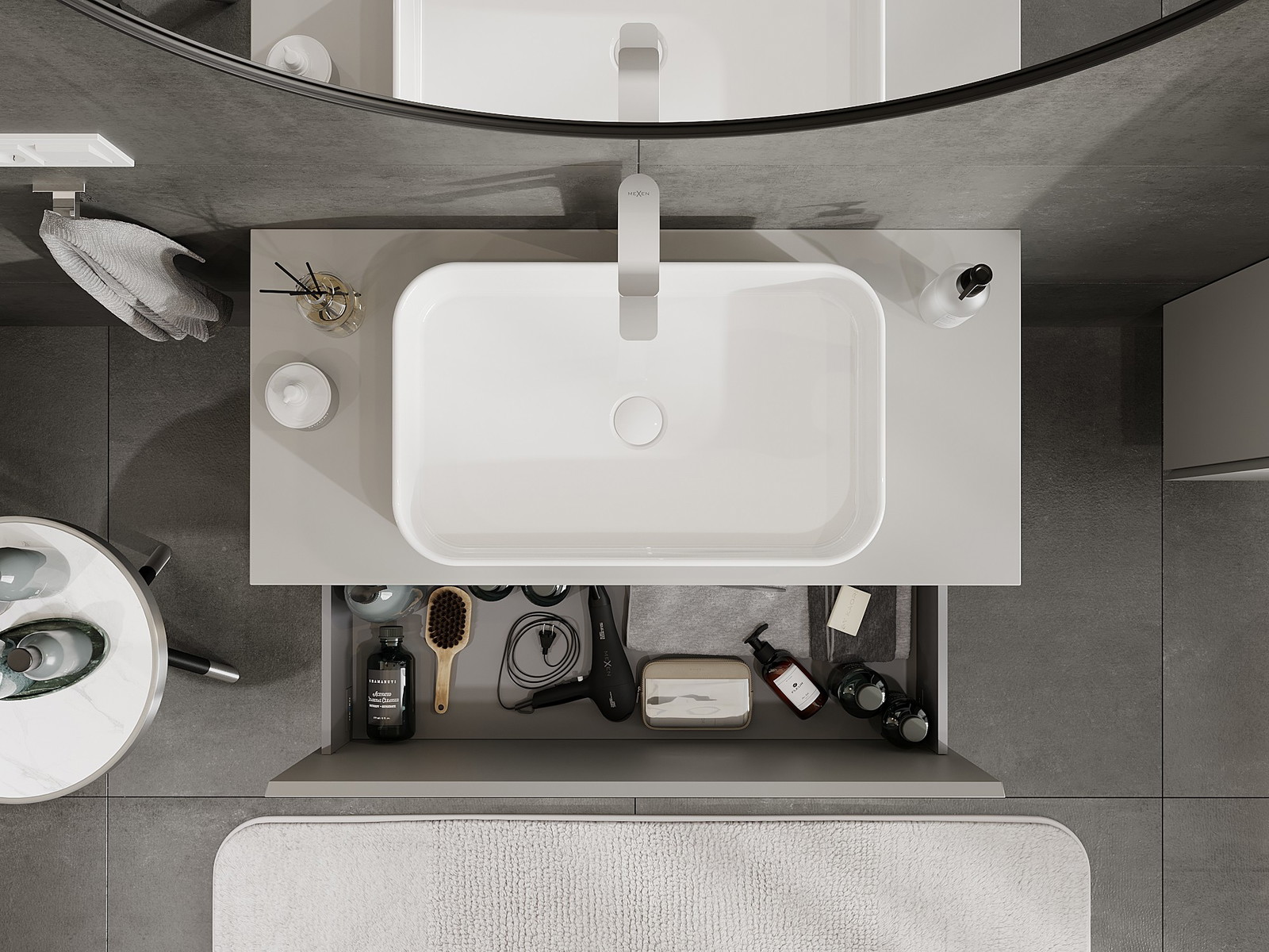 Výrez v zásuvke je navrhnutý tak, aby pojal sifón, ktorý je nevyhnutný v umývadlových inštaláciách. Vďaka tomu môže byť nábytok namontovaný plne funkčne, bez nutnosti vzdávať sa priestoru v zásuvke v prospech inštalácie.