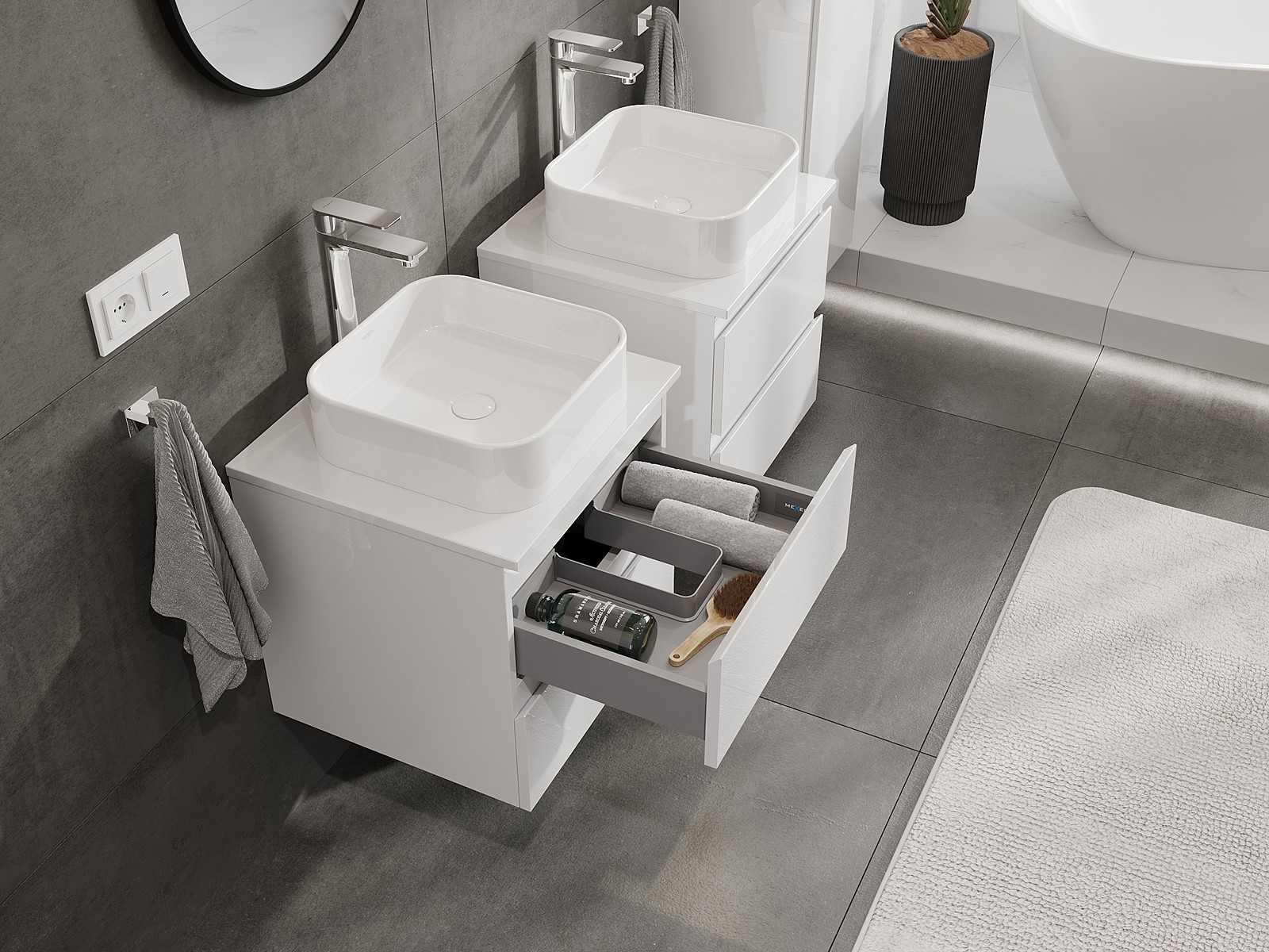 Výrez v zásuvke je navrhnutý tak, aby pojal sifón, ktorý je nevyhnutný v umývadlových inštaláciách. Vďaka tomu môže byť nábytok namontovaný plne funkčne, bez nutnosti vzdávať sa priestoru v zásuvke v prospech inštalácie.