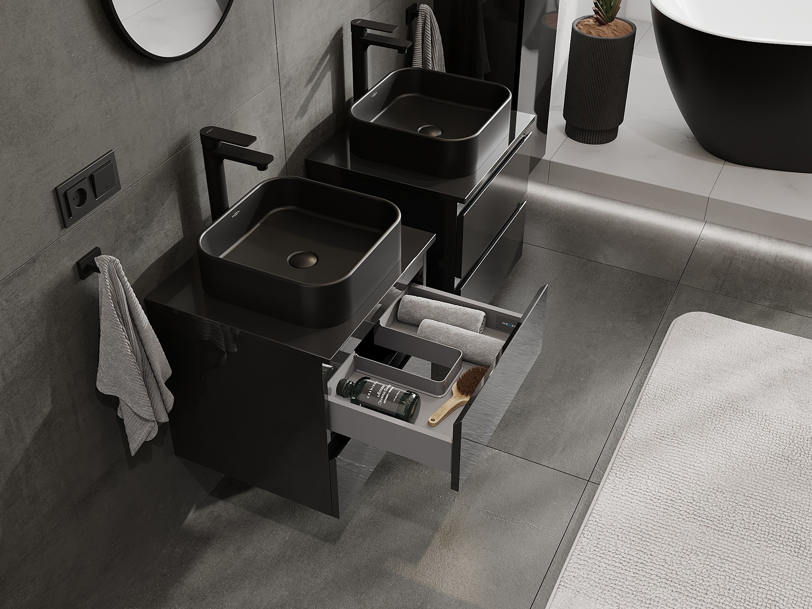 Výrez v zásuvke je navrhnutý tak, aby pojal sifón, ktorý je nevyhnutný v umývadlových inštaláciách. Vďaka tomu môže byť nábytok namontovaný plne funkčne, bez nutnosti vzdávať sa priestoru v zásuvke v prospech inštalácie.