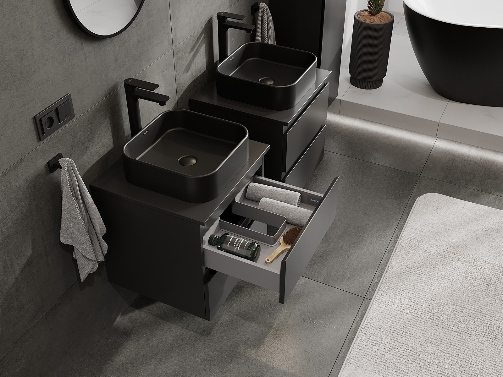 Výrez v zásuvke je navrhnutý tak, aby pojal sifón, ktorý je nevyhnutný v umývadlových inštaláciách. Vďaka tomu môže byť nábytok namontovaný plne funkčne, bez nutnosti vzdávať sa priestoru v zásuvke v prospech inštalácie.