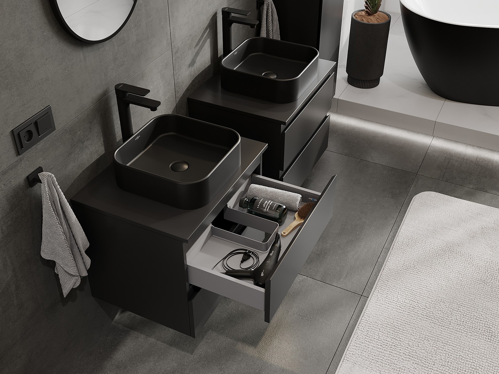 Výrez v zásuvke je navrhnutý tak, aby pojal sifón, ktorý je nevyhnutný v umývadlových inštaláciách. Vďaka tomu môže byť nábytok namontovaný plne funkčne, bez nutnosti vzdávať sa priestoru v zásuvke v prospech inštalácie.