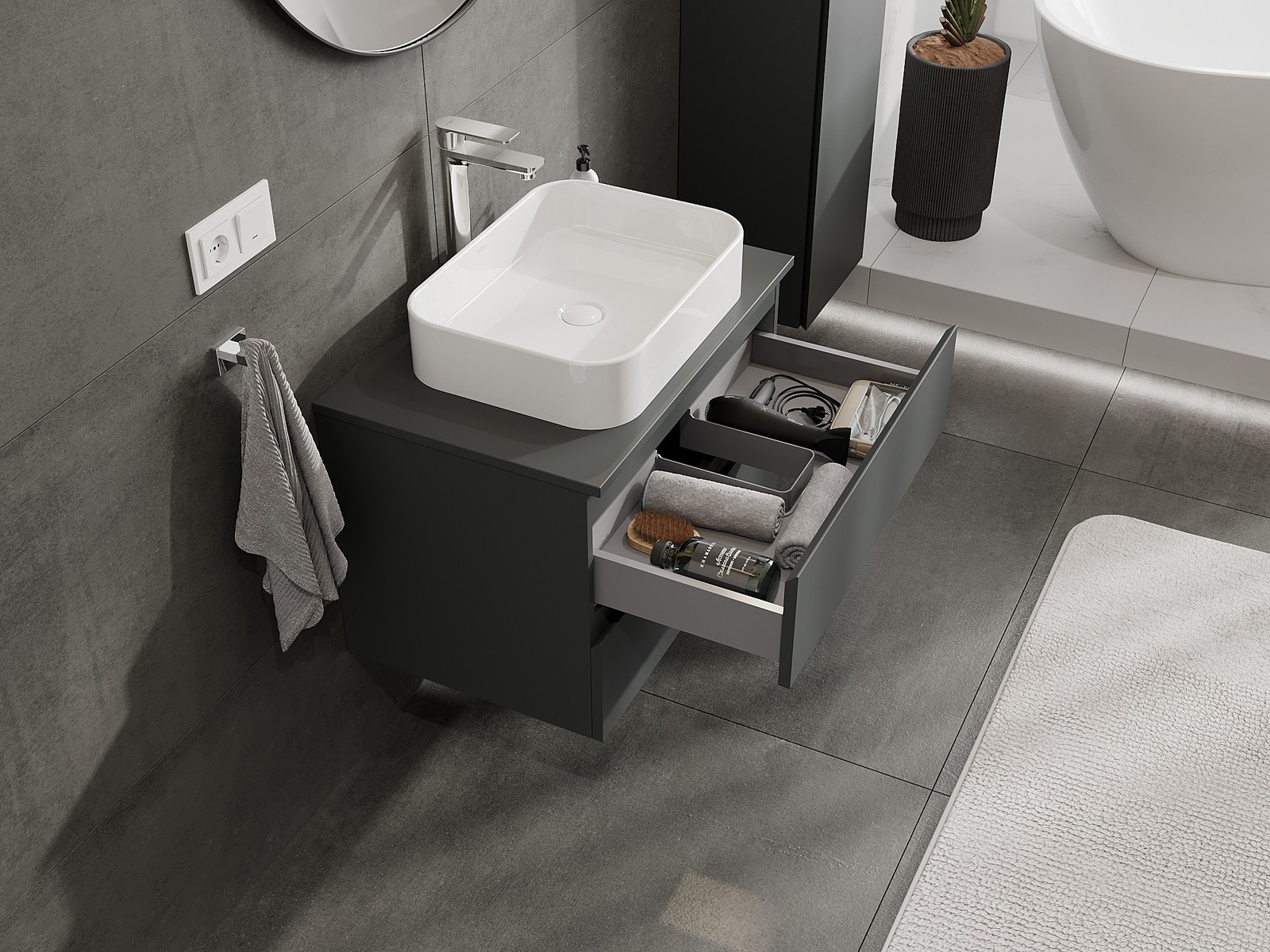 Výrez v zásuvke je navrhnutý tak, aby pojal sifón, ktorý je nevyhnutný v umývadlových inštaláciách. Vďaka tomu môže byť nábytok namontovaný plne funkčne, bez nutnosti vzdávať sa priestoru v zásuvke v prospech inštalácie.