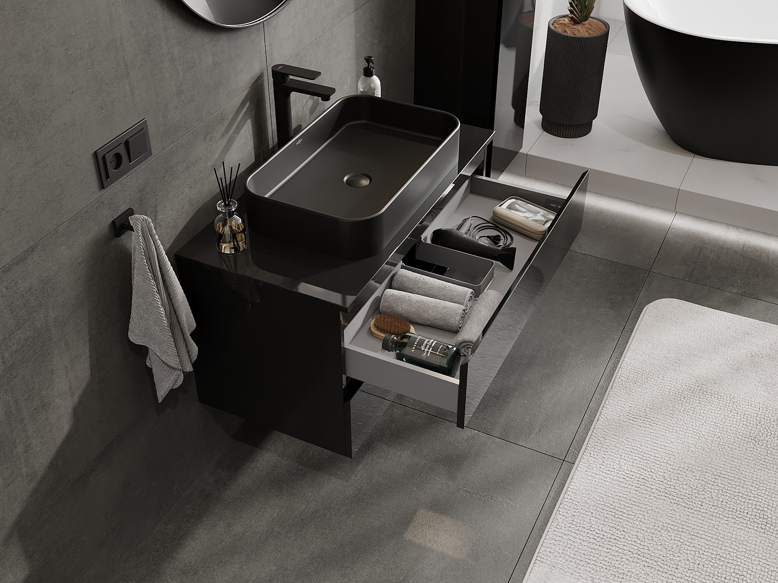 Výrez v zásuvke je navrhnutý tak, aby pojal sifón, ktorý je nevyhnutný v umývadlových inštaláciách. Vďaka tomu môže byť nábytok namontovaný plne funkčne, bez nutnosti vzdávať sa priestoru v zásuvke v prospech inštalácie.