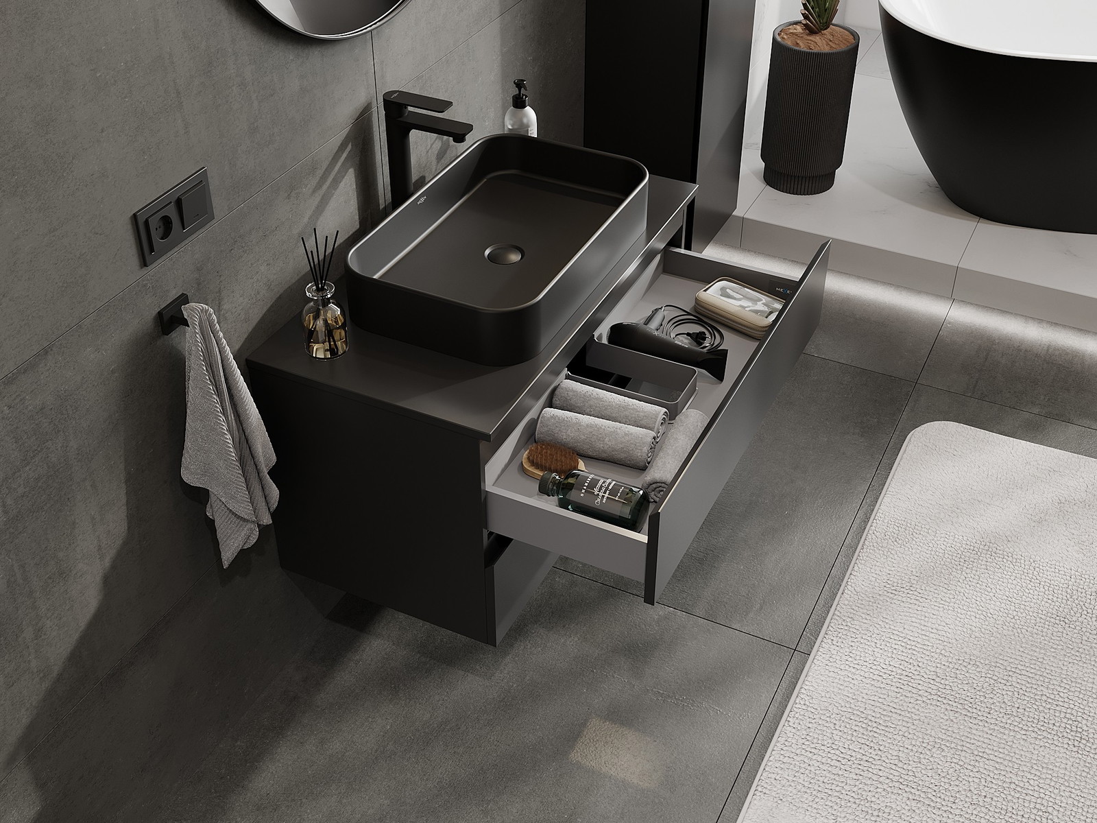 Výrez v zásuvke je navrhnutý tak, aby pojal sifón, ktorý je nevyhnutný v umývadlových inštaláciách. Vďaka tomu môže byť nábytok namontovaný plne funkčne, bez nutnosti vzdávať sa priestoru v zásuvke v prospech inštalácie.