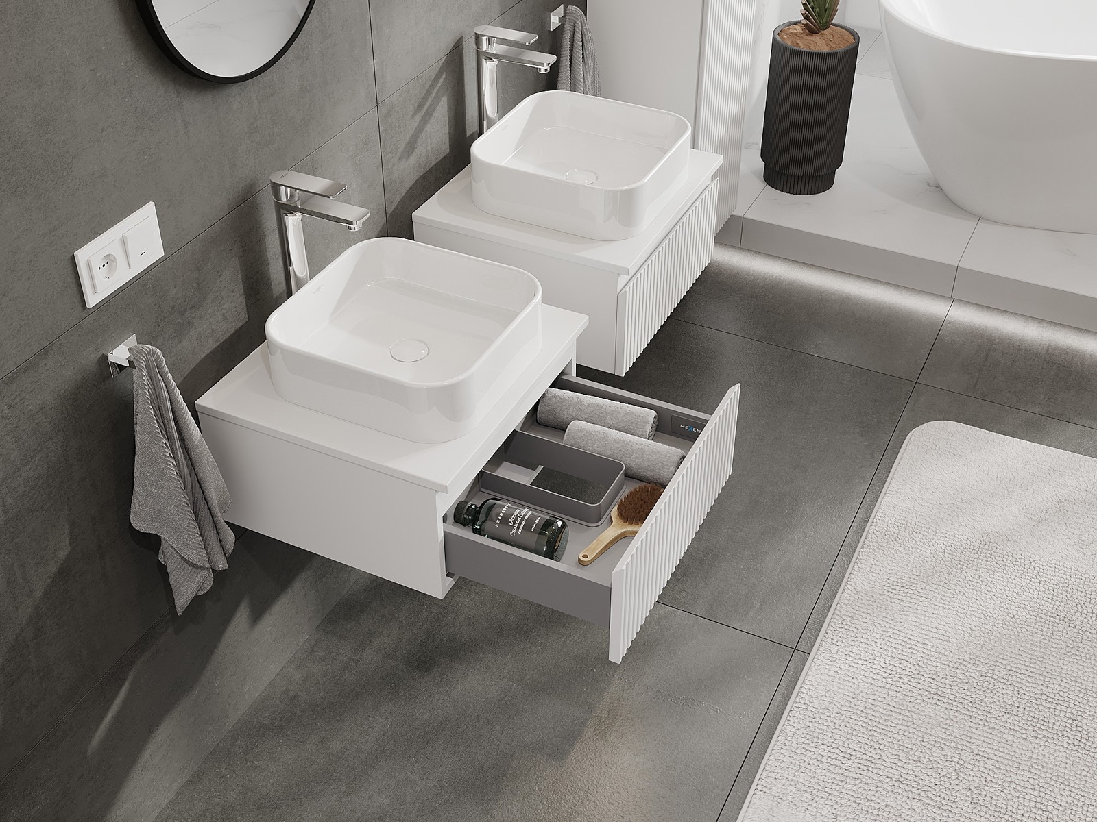 Naše modulárne kúpeľňové nábytkové prvky možno kombinovať v rôznych farebných konfiguráciách, čo umožňuje úplnú personalizáciu. Môžete si vybrať vzhľad aj funkcie jednotlivých prvkov, čo umožňuje prispôsobiť nábytok vašim vlastným štýlovým a používateľským preferenciám.