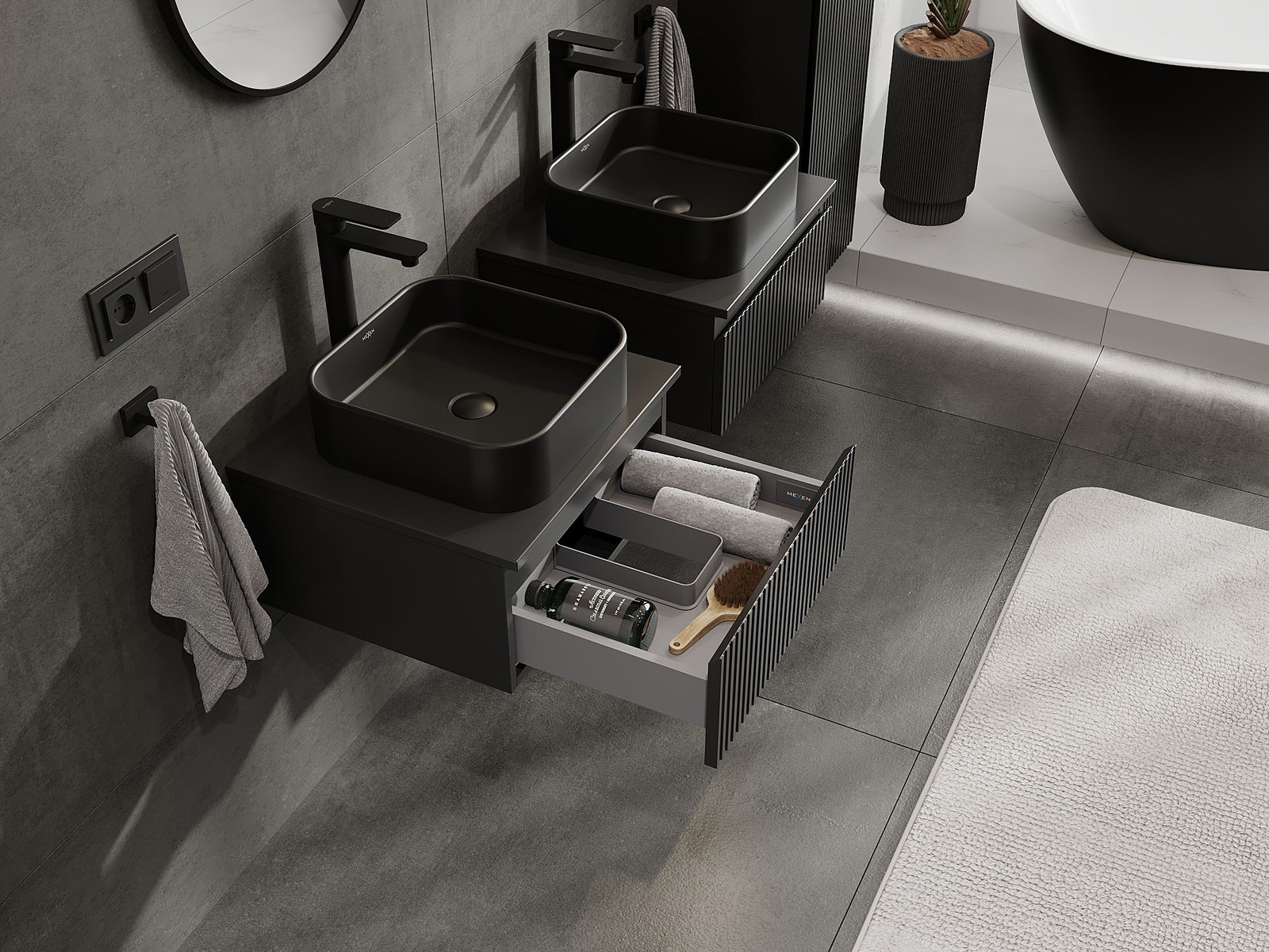 Mexen Rivel kúpeľňová skrinka pod umývadlo 50 cm s doskou, 1 zásuvka, ryhovaná, čierna mat - 91A20-05023-1-BFC71