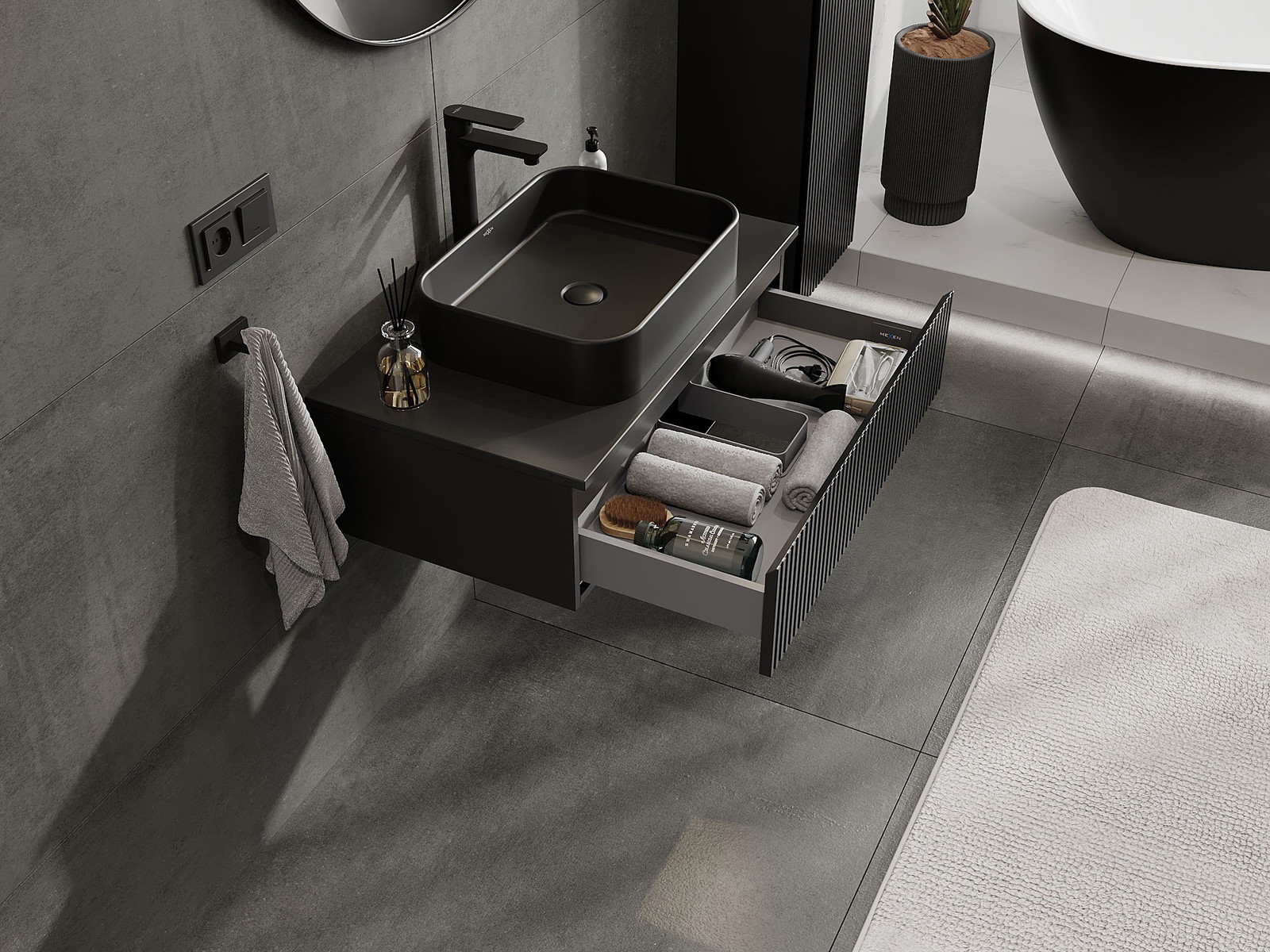 Výrez v zásuvke je navrhnutý tak, aby pojal sifón, ktorý je nevyhnutný v umývadlových inštaláciách. Vďaka tomu môže byť nábytok namontovaný plne funkčne, bez nutnosti vzdávať sa priestoru v zásuvke v prospech inštalácie.