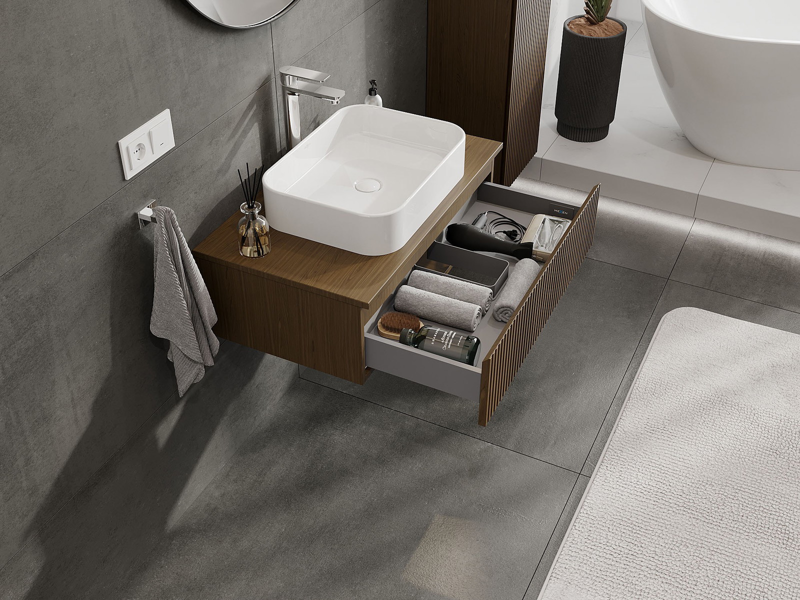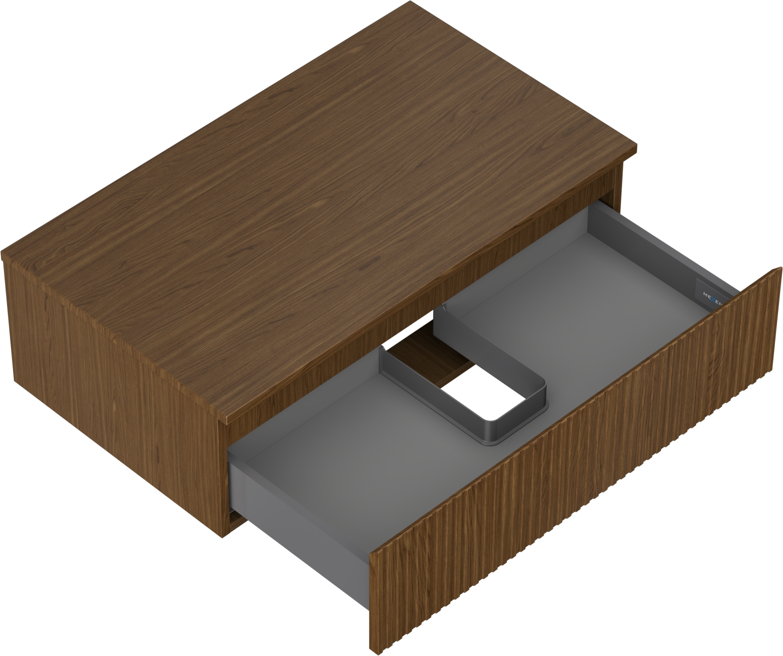 Výrez v zásuvke je navrhnutý tak, aby pojal sifón, ktorý je nevyhnutný v umývadlových inštaláciách. Vďaka tomu môže byť nábytok namontovaný plne funkčne, bez nutnosti vzdávať sa priestoru v zásuvke v prospech inštalácie.
