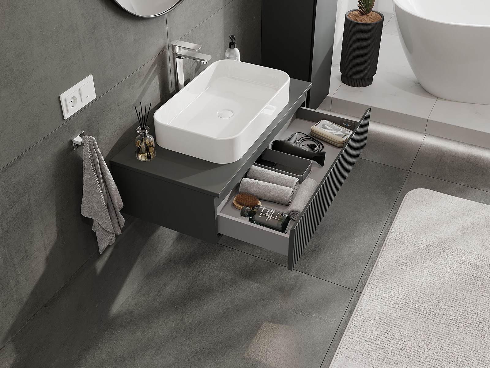 Výrez v zásuvke je navrhnutý tak, aby pojal sifón, ktorý je nevyhnutný v umývadlových inštaláciách. Vďaka tomu môže byť nábytok namontovaný plne funkčne, bez nutnosti vzdávať sa priestoru v zásuvke v prospech inštalácie.