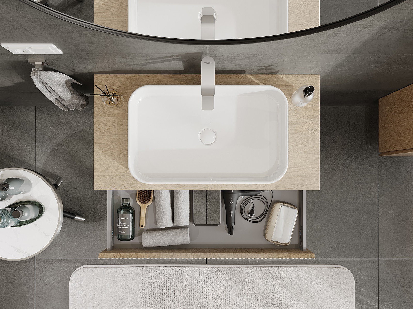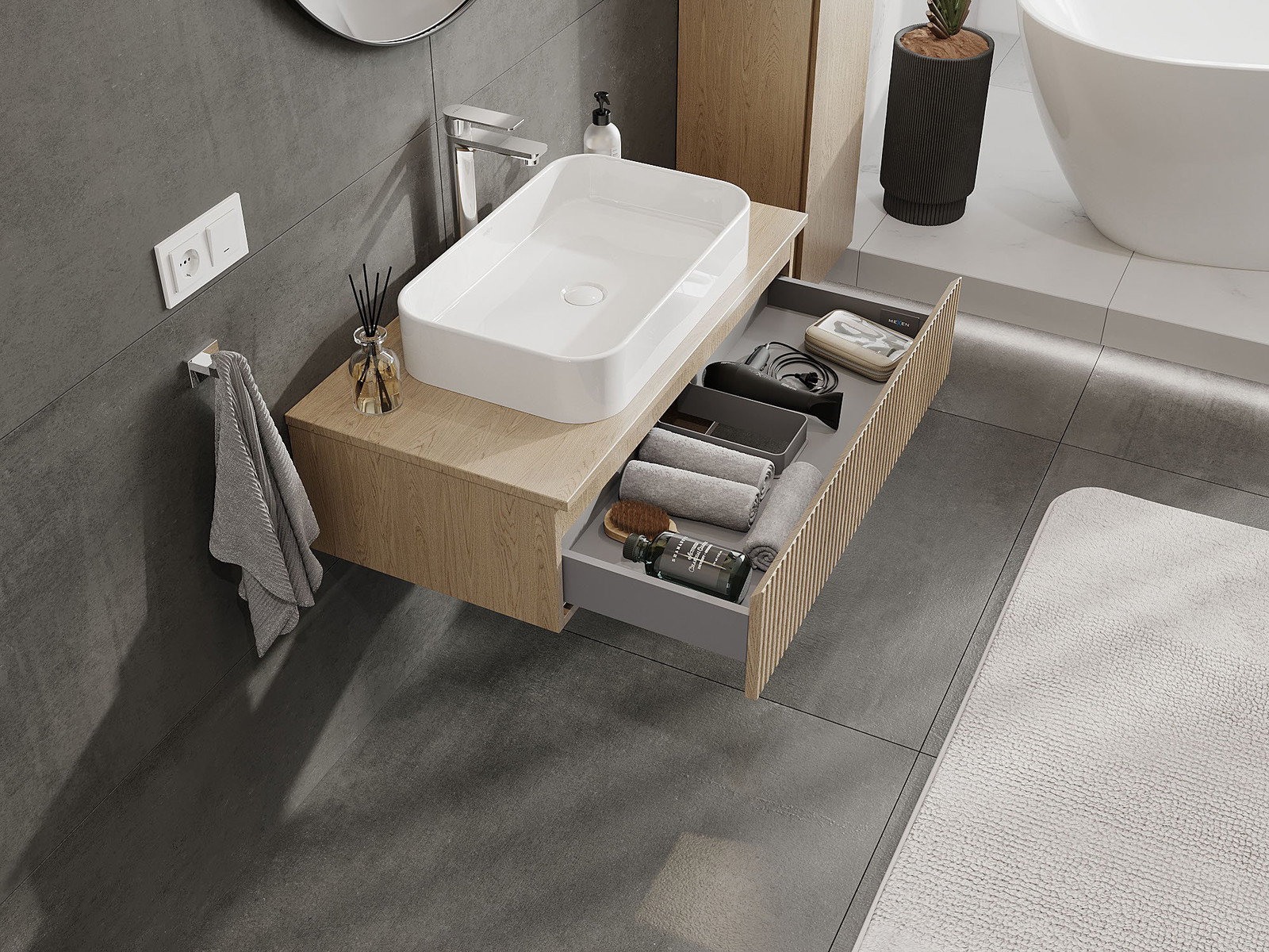 Výrez v zásuvke je navrhnutý tak, aby pojal sifón, ktorý je nevyhnutný v umývadlových inštaláciách. Vďaka tomu môže byť nábytok namontovaný plne funkčne, bez nutnosti vzdávať sa priestoru v zásuvke v prospech inštalácie.
