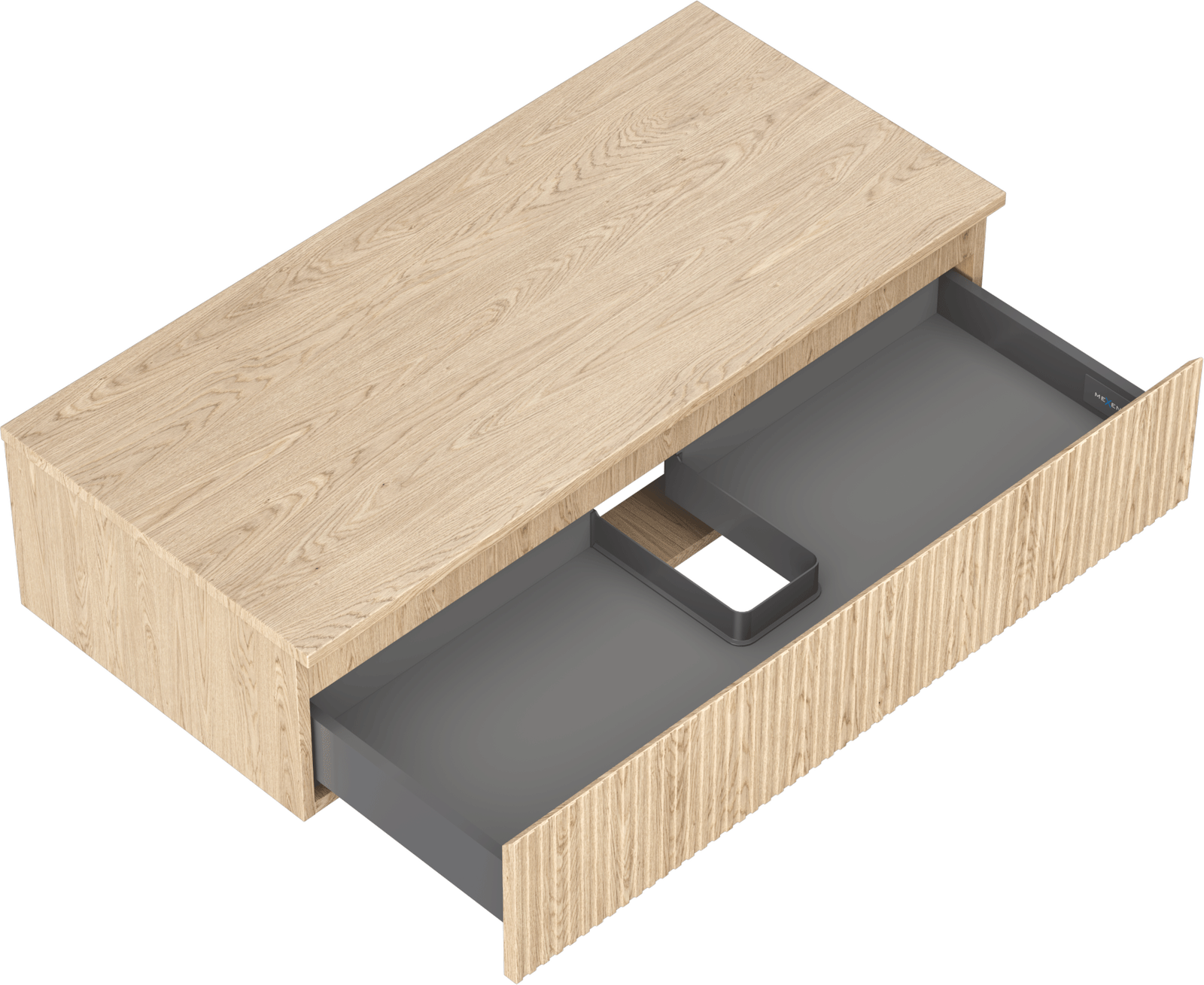 Výrez v zásuvke je navrhnutý tak, aby pojal sifón, ktorý je nevyhnutný v umývadlových inštaláciách. Vďaka tomu môže byť nábytok namontovaný plne funkčne, bez nutnosti vzdávať sa priestoru v zásuvke v prospech inštalácie.