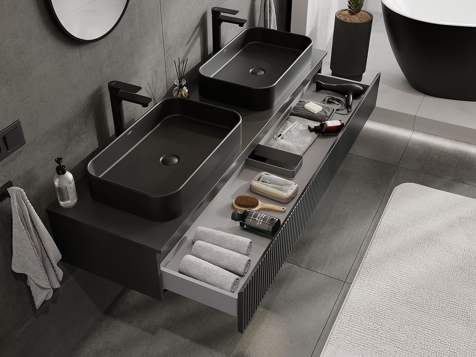 Výrez v zásuvke je navrhnutý tak, aby pojal sifón, ktorý je nevyhnutný v umývadlových inštaláciách. Vďaka tomu môže byť nábytok namontovaný plne funkčne, bez nutnosti vzdávať sa priestoru v zásuvke v prospech inštalácie.