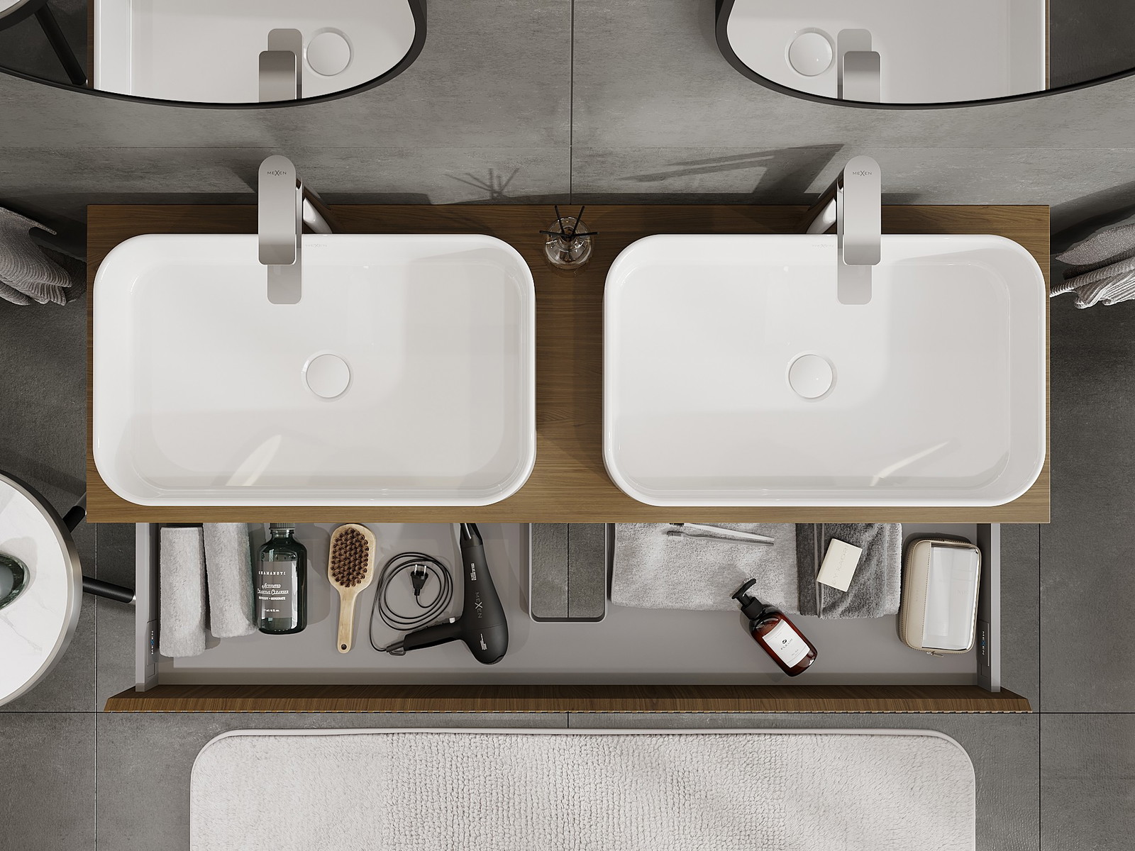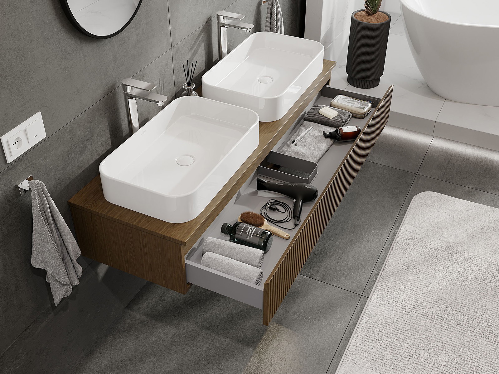 Výrez v zásuvke je navrhnutý tak, aby pojal sifón, ktorý je nevyhnutný v umývadlových inštaláciách. Vďaka tomu môže byť nábytok namontovaný plne funkčne, bez nutnosti vzdávať sa priestoru v zásuvke v prospech inštalácie.