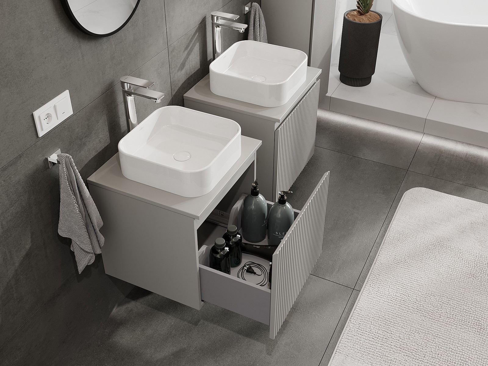 Naše modulárne kúpeľňové nábytkové prvky možno kombinovať v rôznych farebných konfiguráciách, čo umožňuje úplnú personalizáciu. Môžete si vybrať vzhľad aj funkcie jednotlivých prvkov, čo umožňuje prispôsobiť nábytok vašim vlastným štýlovým a používateľským preferenciám.