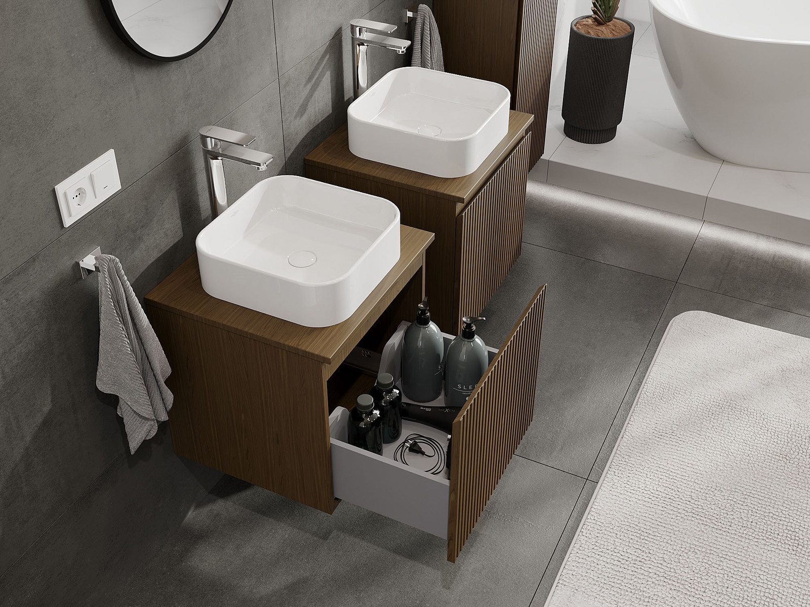 Výrez v zásuvke je navrhnutý tak, aby pojal sifón, ktorý je nevyhnutný v umývadlových inštaláciách. Vďaka tomu môže byť nábytok namontovaný plne funkčne, bez nutnosti vzdávať sa priestoru v zásuvke v prospech inštalácie.