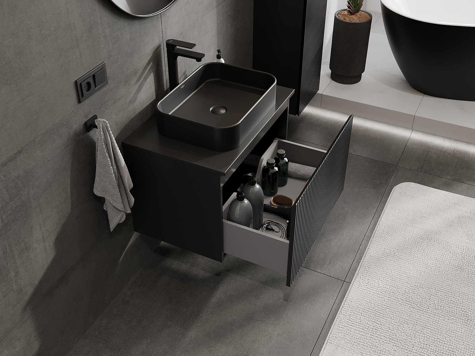 Výrez v zásuvke je navrhnutý tak, aby pojal sifón, ktorý je nevyhnutný v umývadlových inštaláciách. Vďaka tomu môže byť nábytok namontovaný plne funkčne, bez nutnosti vzdávať sa priestoru v zásuvke v prospech inštalácie.
