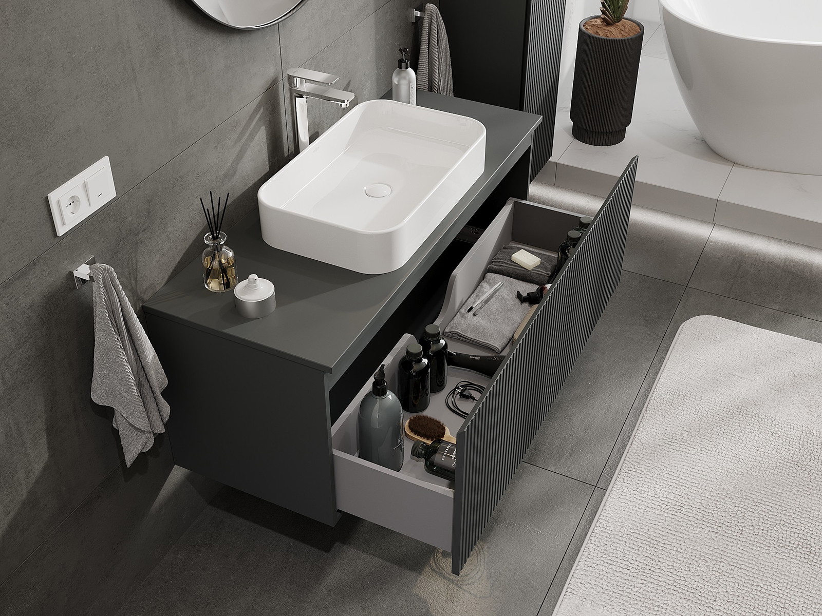 Výrez v zásuvke je navrhnutý tak, aby pojal sifón, ktorý je nevyhnutný v umývadlových inštaláciách. Vďaka tomu môže byť nábytok namontovaný plne funkčne, bez nutnosti vzdávať sa priestoru v zásuvke v prospech inštalácie.