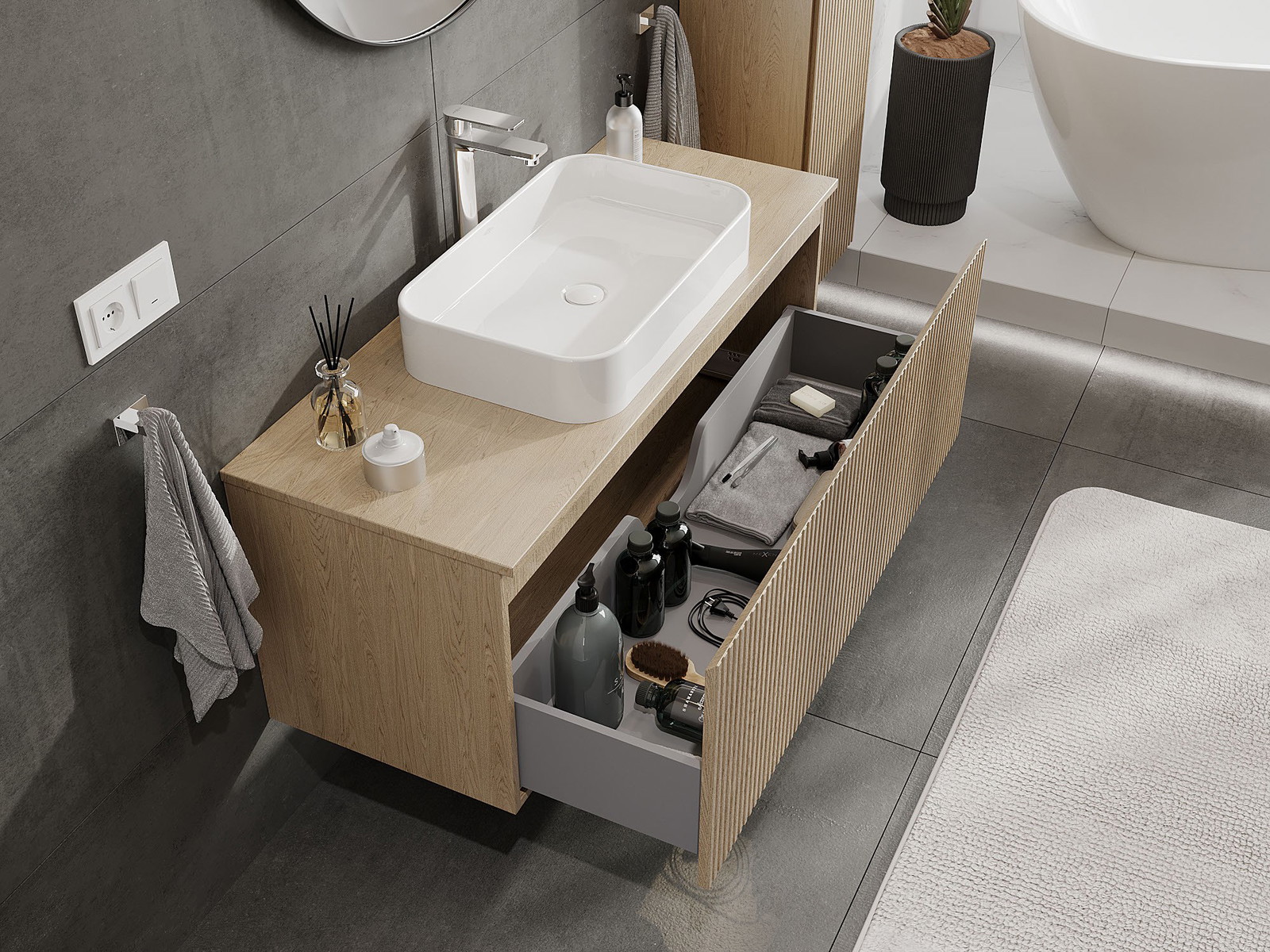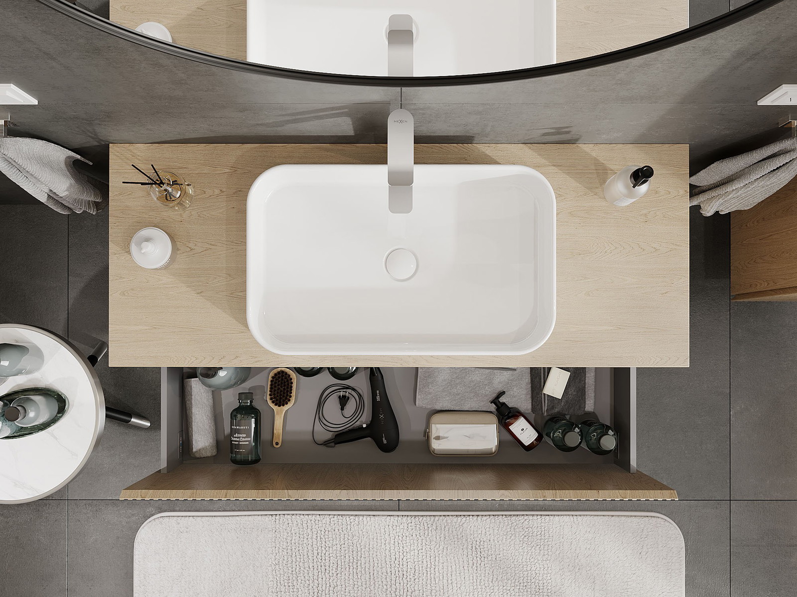 Výrez v zásuvke je navrhnutý tak, aby pojal sifón, ktorý je nevyhnutný v umývadlových inštaláciách. Vďaka tomu môže byť nábytok namontovaný plne funkčne, bez nutnosti vzdávať sa priestoru v zásuvke v prospech inštalácie.