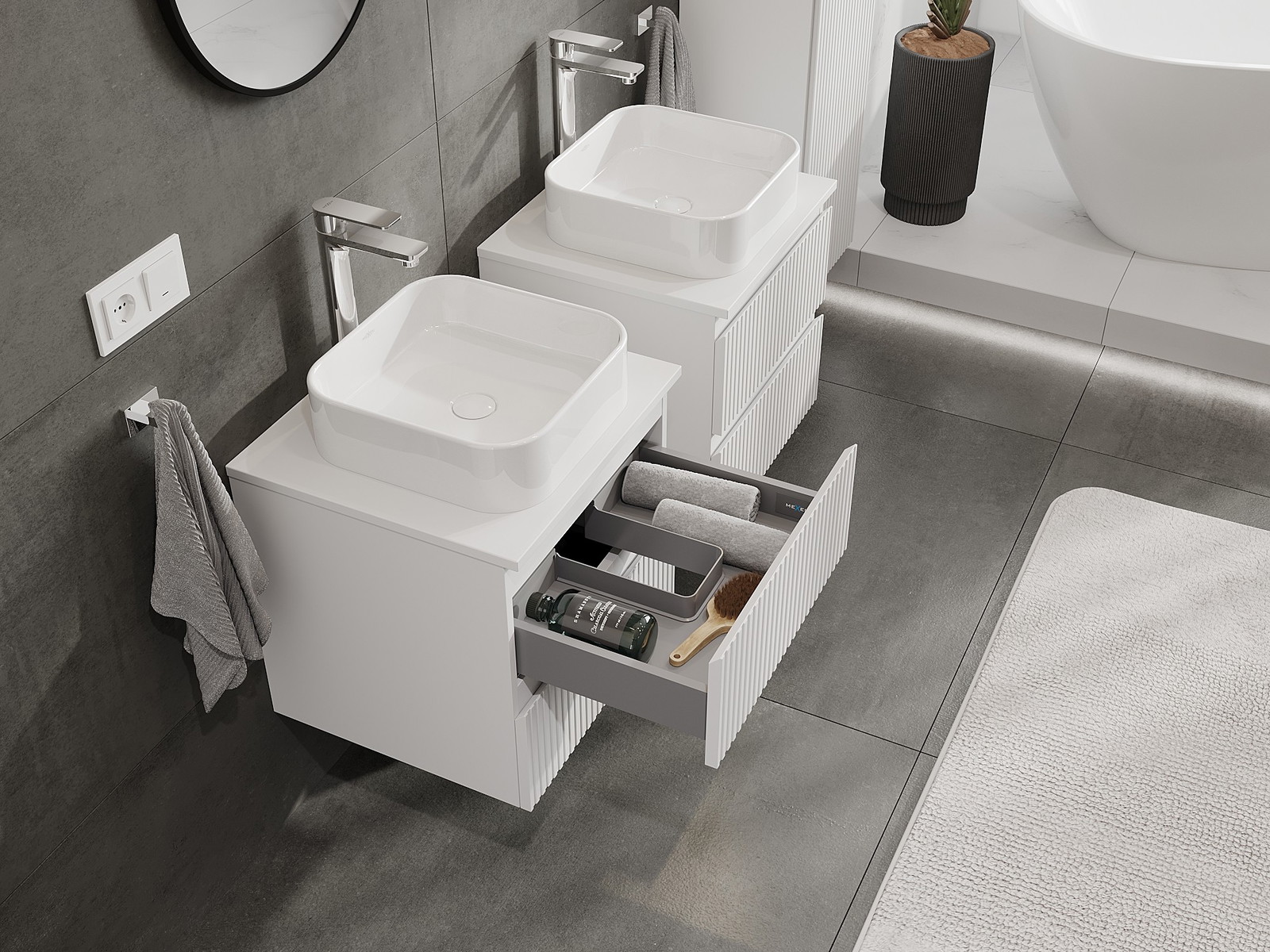 Naše modulárne kúpeľňové nábytkové prvky možno kombinovať v rôznych farebných konfiguráciách, čo umožňuje úplnú personalizáciu. Môžete si vybrať vzhľad aj funkcie jednotlivých prvkov, čo umožňuje prispôsobiť nábytok vašim vlastným štýlovým a používateľským preferenciám.