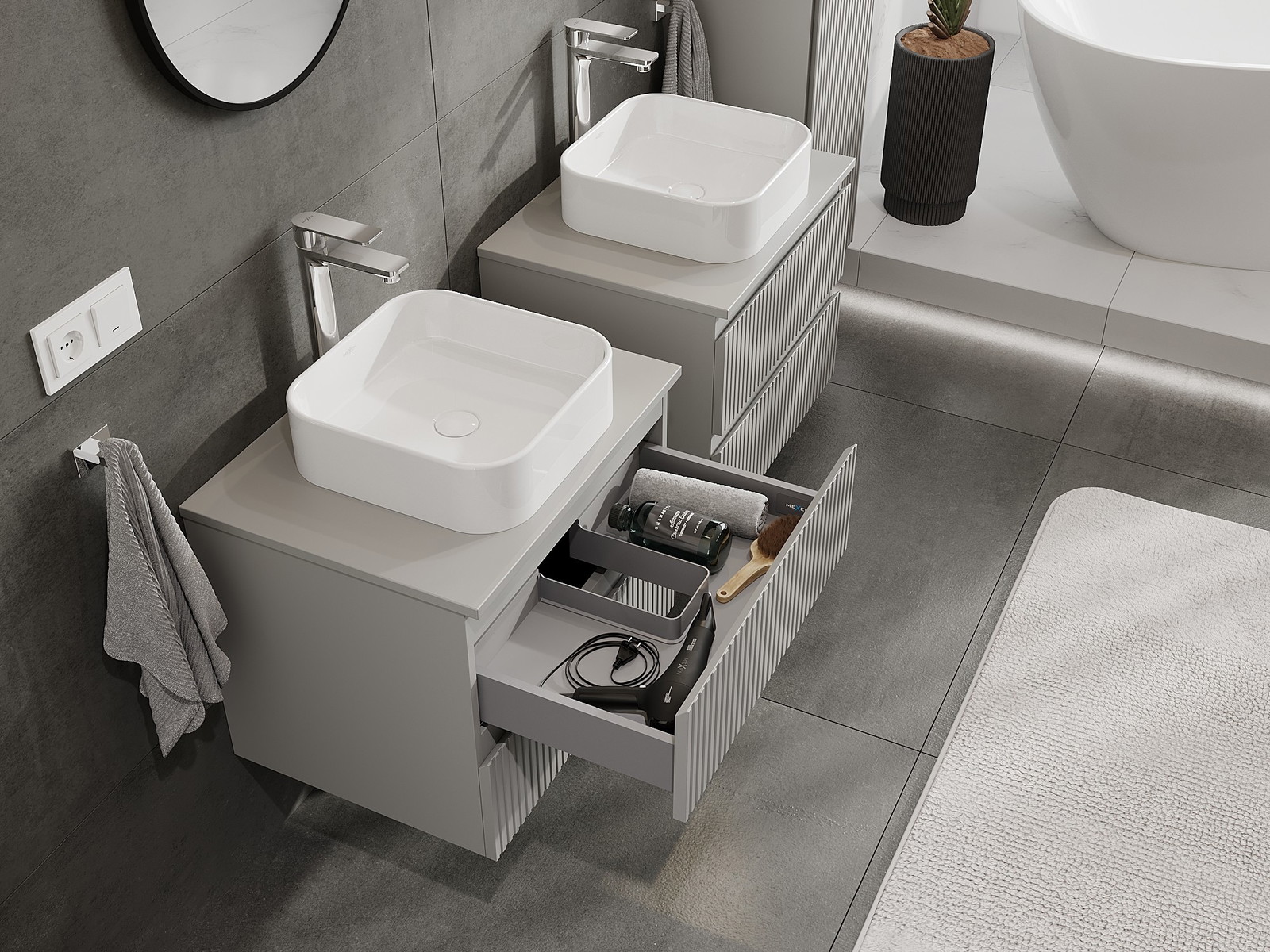 Výrez v zásuvke je navrhnutý tak, aby pojal sifón, ktorý je nevyhnutný v umývadlových inštaláciách. Vďaka tomu môže byť nábytok namontovaný plne funkčne, bez nutnosti vzdávať sa priestoru v zásuvke v prospech inštalácie.