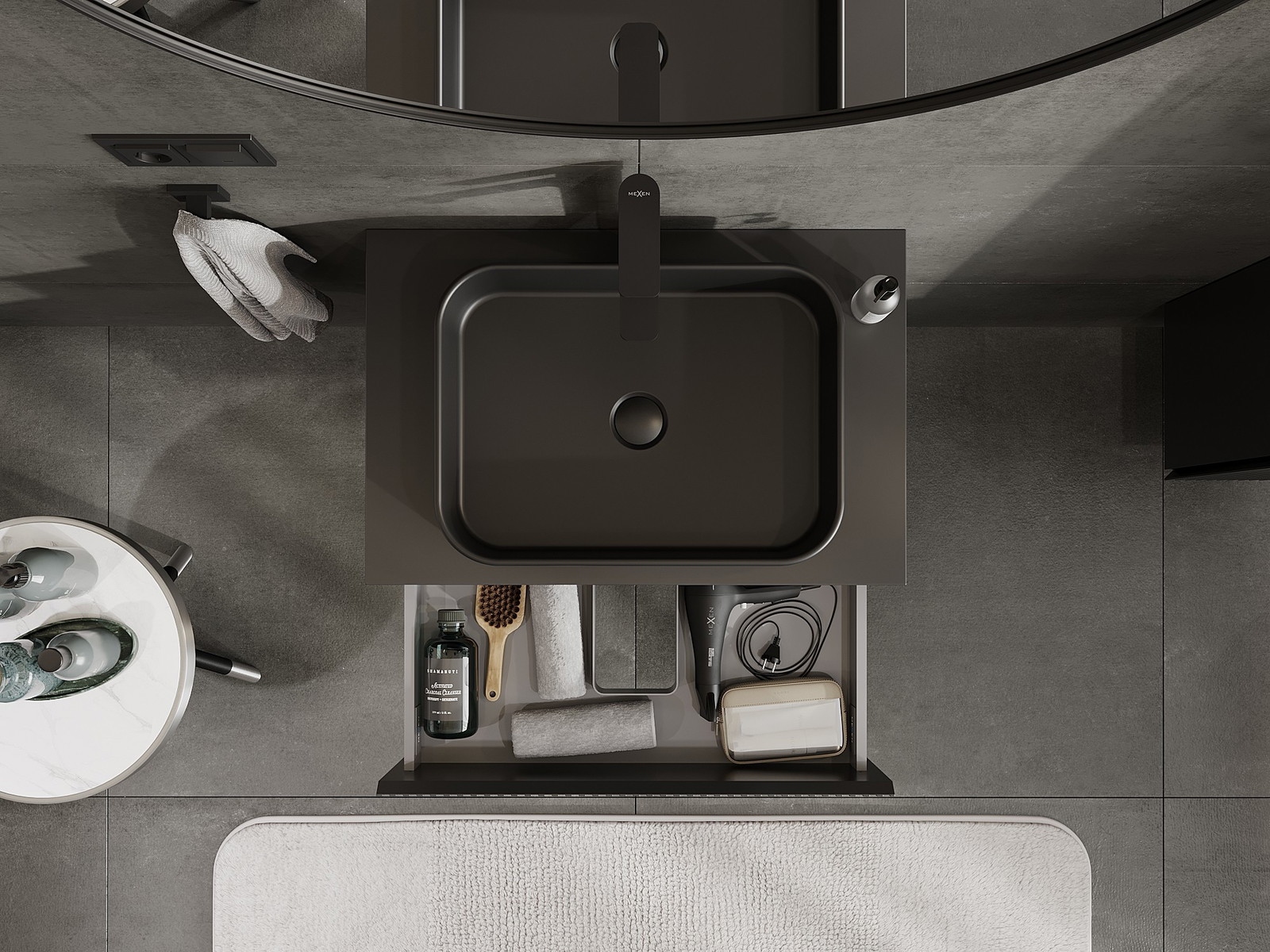Výrez v zásuvke je navrhnutý tak, aby pojal sifón, ktorý je nevyhnutný v umývadlových inštaláciách. Vďaka tomu môže byť nábytok namontovaný plne funkčne, bez nutnosti vzdávať sa priestoru v zásuvke v prospech inštalácie.