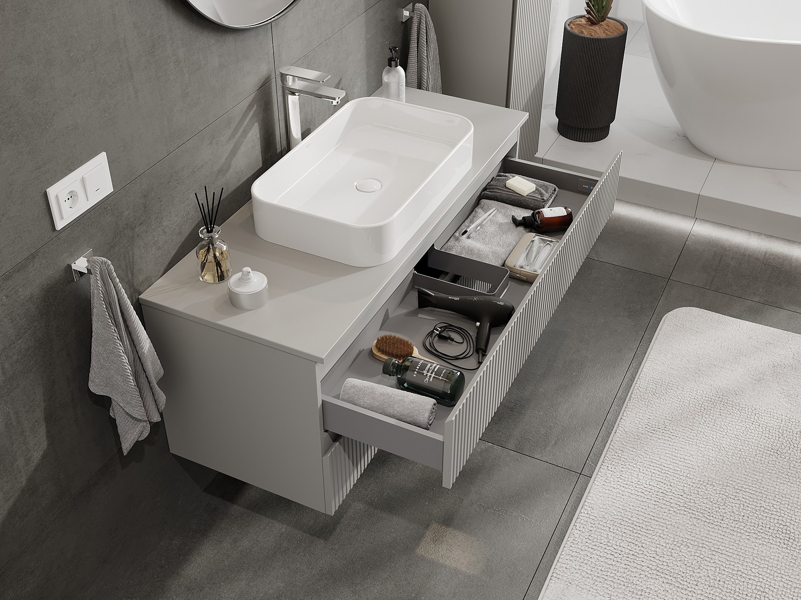 Výrez v zásuvke je navrhnutý tak, aby pojal sifón, ktorý je nevyhnutný v umývadlových inštaláciách. Vďaka tomu môže byť nábytok namontovaný plne funkčne, bez nutnosti vzdávať sa priestoru v zásuvke v prospech inštalácie.