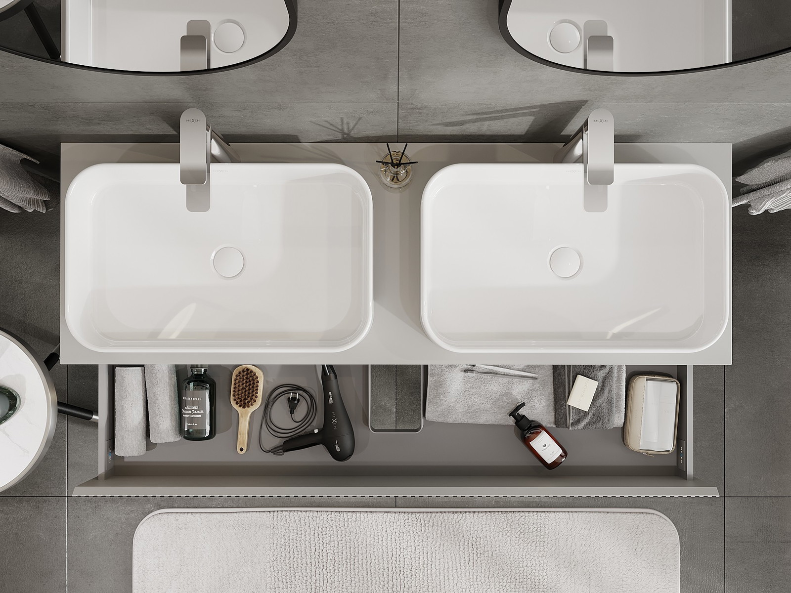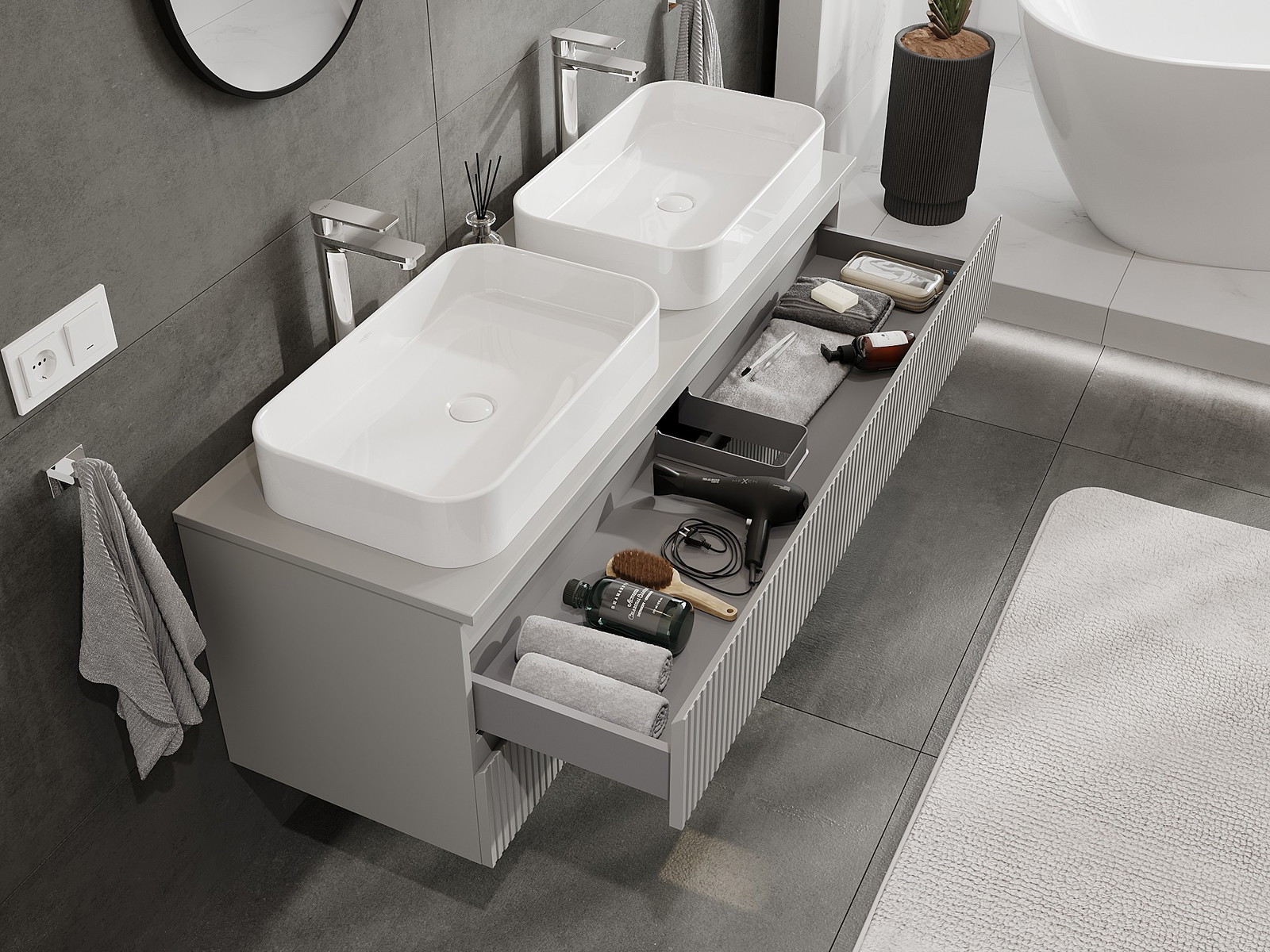 Výrez v zásuvke je navrhnutý tak, aby pojal sifón, ktorý je nevyhnutný v umývadlových inštaláciách. Vďaka tomu môže byť nábytok namontovaný plne funkčne, bez nutnosti vzdávať sa priestoru v zásuvke v prospech inštalácie.