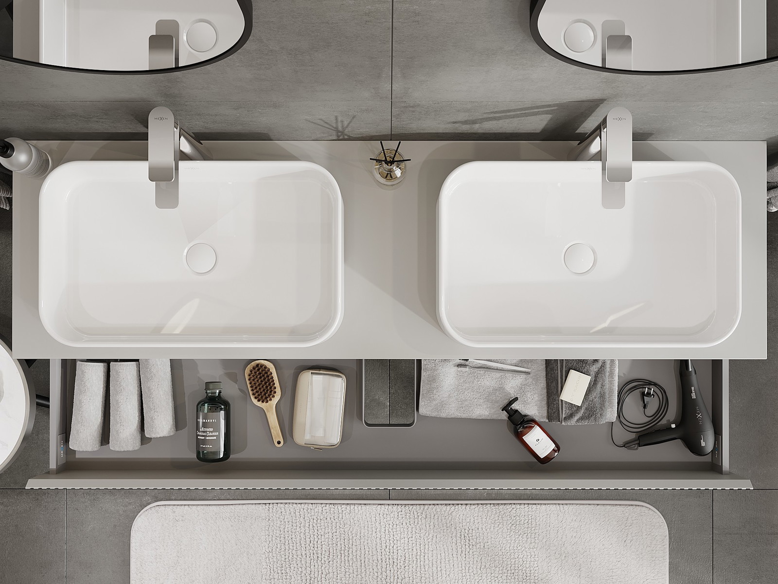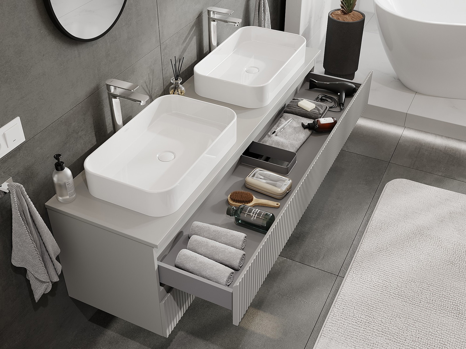 Výrez v zásuvke je navrhnutý tak, aby pojal sifón, ktorý je nevyhnutný v umývadlových inštaláciách. Vďaka tomu môže byť nábytok namontovaný plne funkčne, bez nutnosti vzdávať sa priestoru v zásuvke v prospech inštalácie.