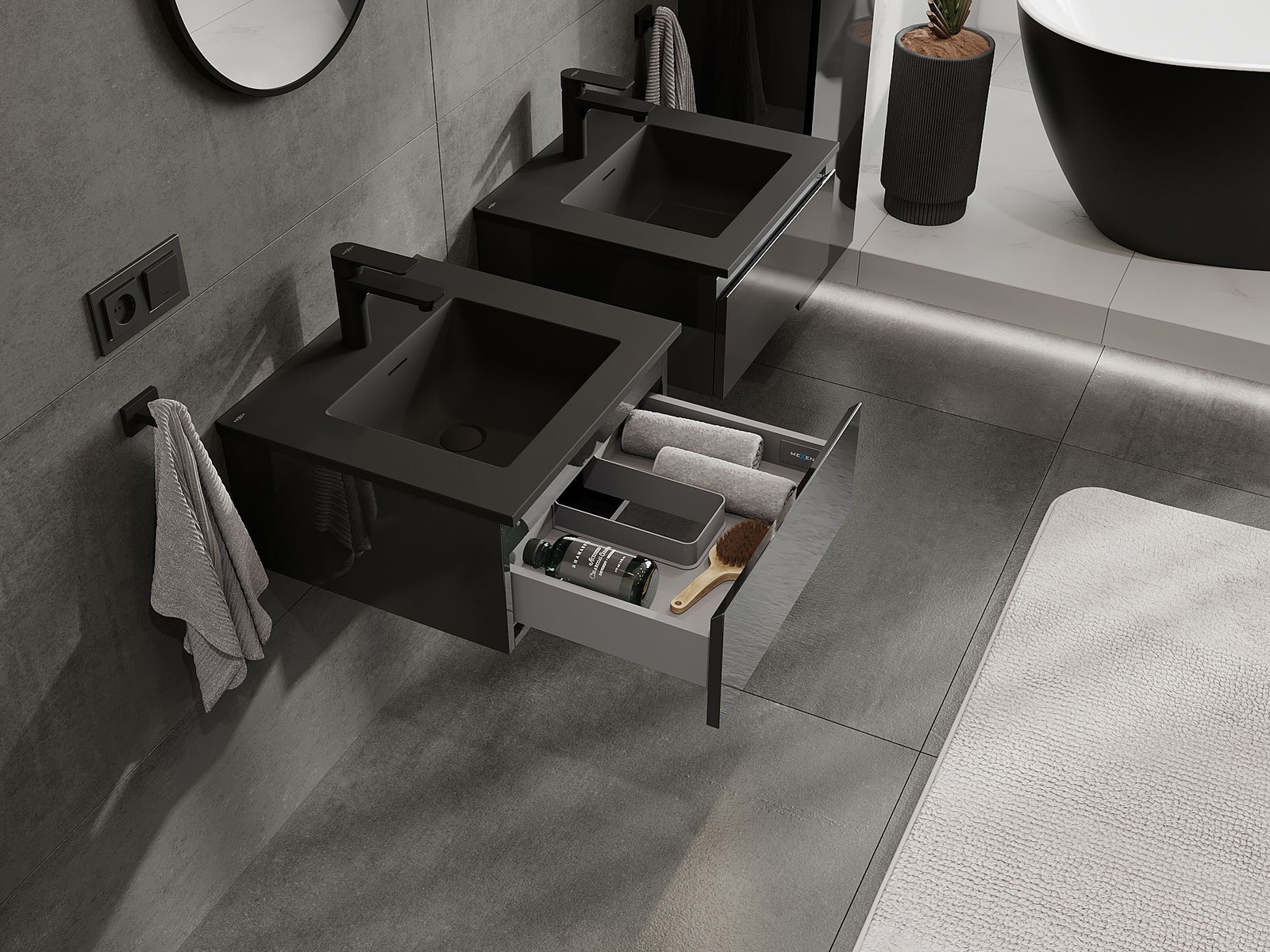 Mexen Orio kúpeľňová skrinka 50 cm s umývadlom Otis, 1 zásuvka, čierny lesk/čierny mat - 91A10-05023-1-BF70-W18M71