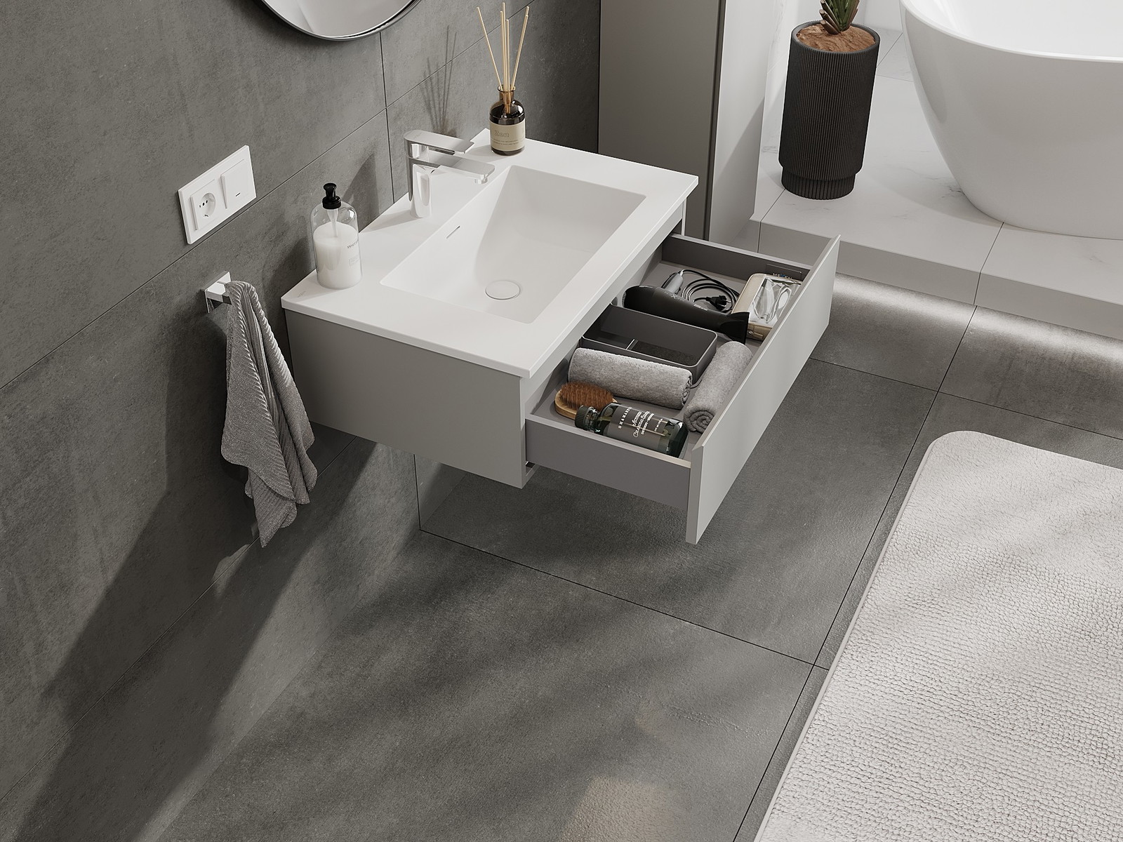 Výrez v zásuvke je navrhnutý tak, aby pojal sifón, ktorý je nevyhnutný v umývadlových inštaláciách. Vďaka tomu môže byť nábytok namontovaný plne funkčne, bez nutnosti vzdávať sa priestoru v zásuvke v prospech inštalácie.