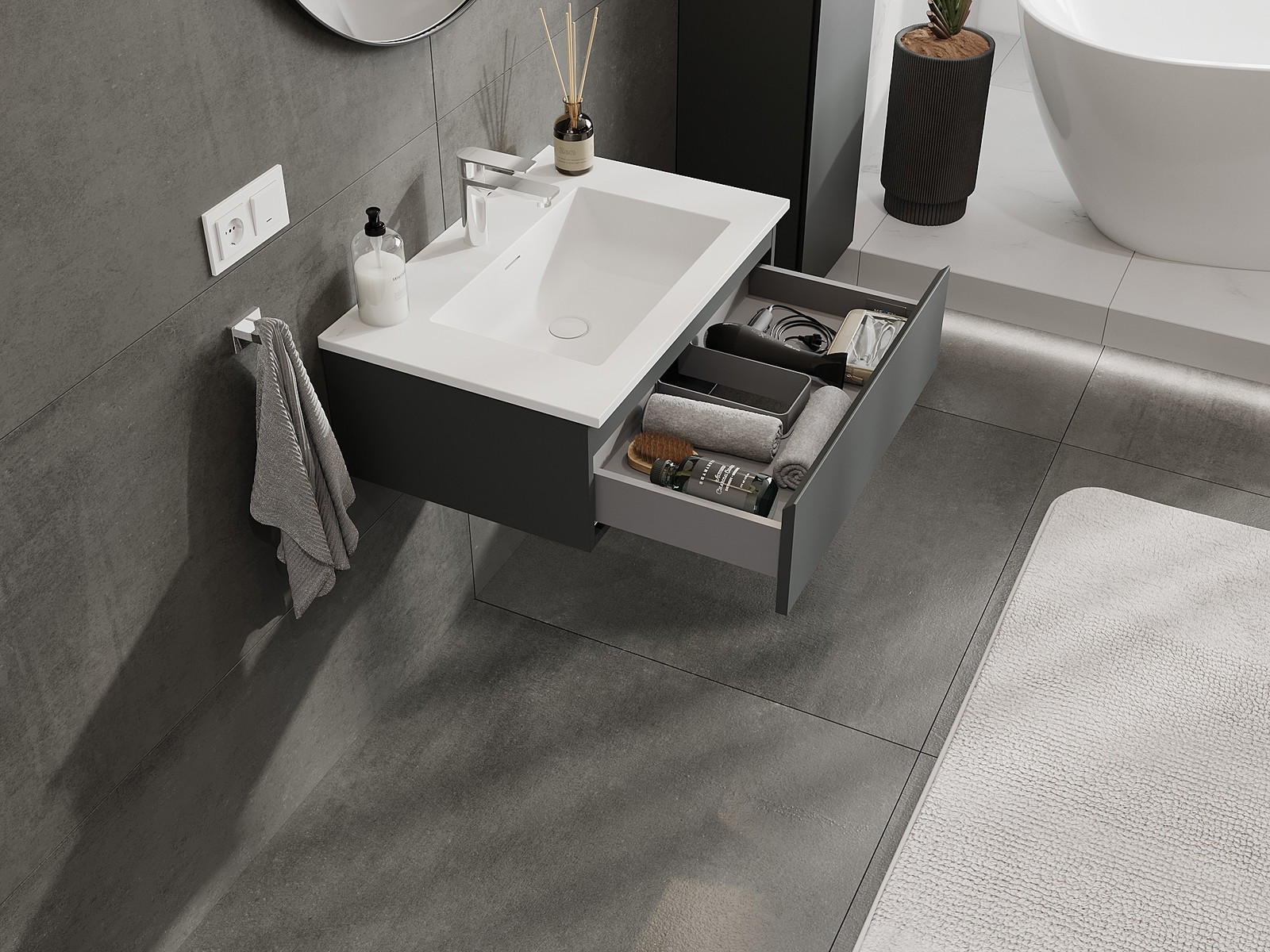 Výrez v zásuvke je navrhnutý tak, aby pojal sifón, ktorý je nevyhnutný v umývadlových inštaláciách. Vďaka tomu môže byť nábytok namontovaný plne funkčne, bez nutnosti vzdávať sa priestoru v zásuvke v prospech inštalácie.