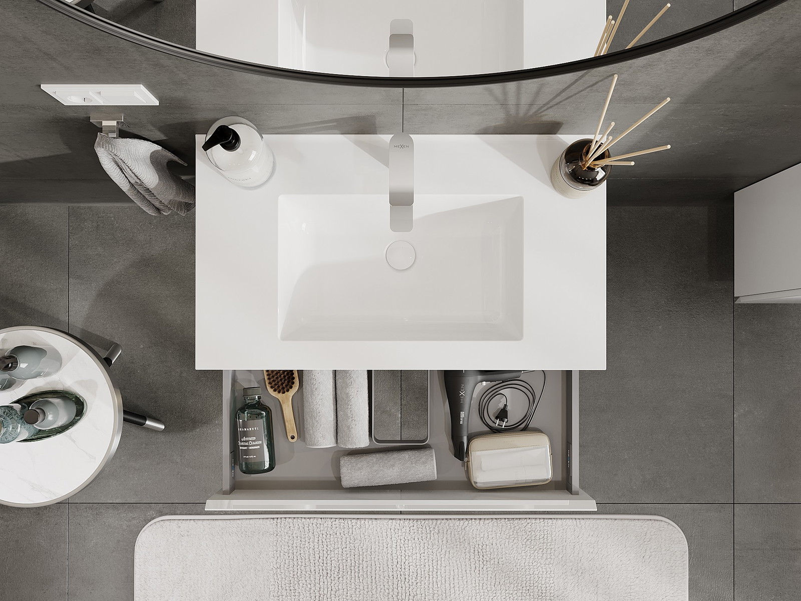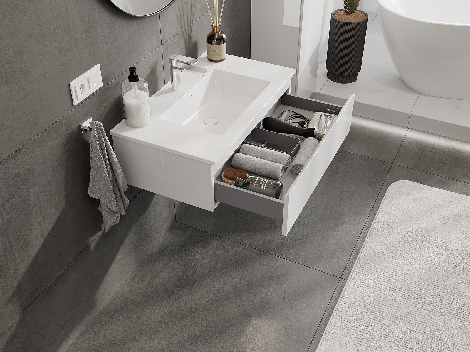 Výrez v zásuvke je navrhnutý tak, aby pojal sifón, ktorý je nevyhnutný v umývadlových inštaláciách. Vďaka tomu môže byť nábytok namontovaný plne funkčne, bez nutnosti vzdávať sa priestoru v zásuvke v prospech inštalácie.