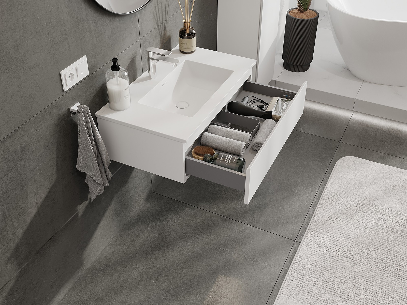 Výrez v zásuvke je navrhnutý tak, aby pojal sifón, ktorý je nevyhnutný v umývadlových inštaláciách. Vďaka tomu môže byť nábytok namontovaný plne funkčne, bez nutnosti vzdávať sa priestoru v zásuvke v prospech inštalácie.