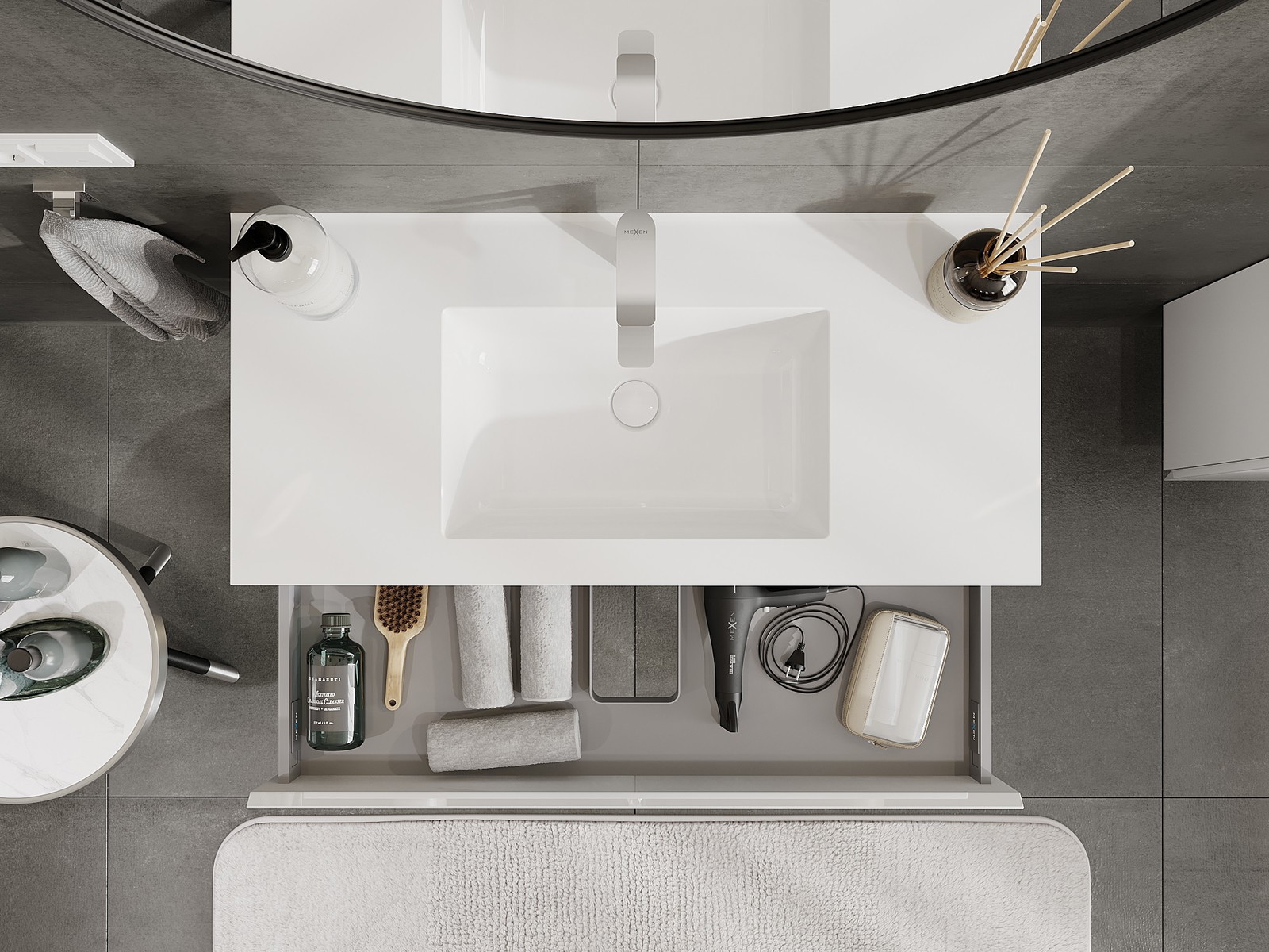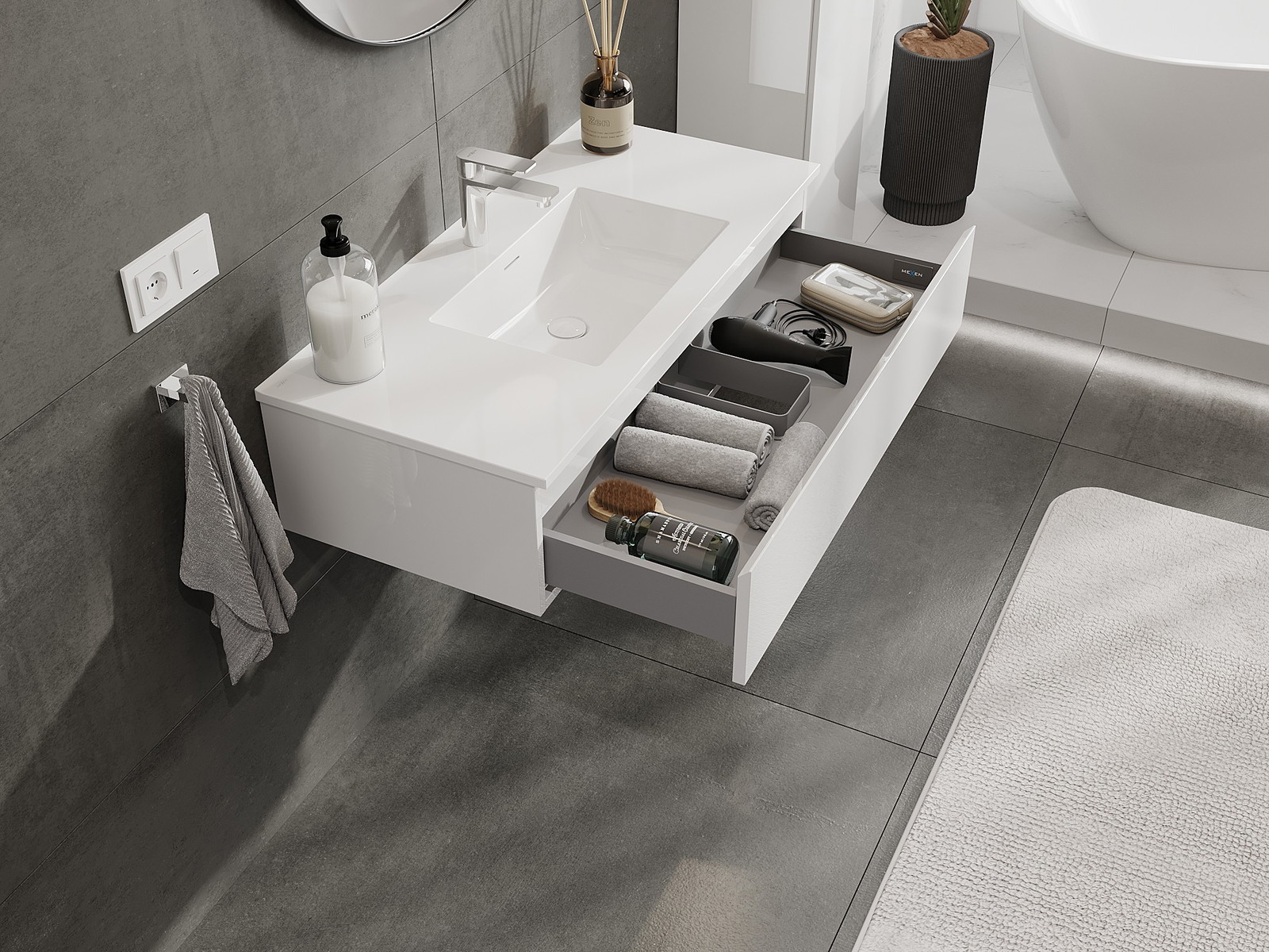 Výrez v zásuvke je navrhnutý tak, aby pojal sifón, ktorý je nevyhnutný v umývadlových inštaláciách. Vďaka tomu môže byť nábytok namontovaný plne funkčne, bez nutnosti vzdávať sa priestoru v zásuvke v prospech inštalácie.