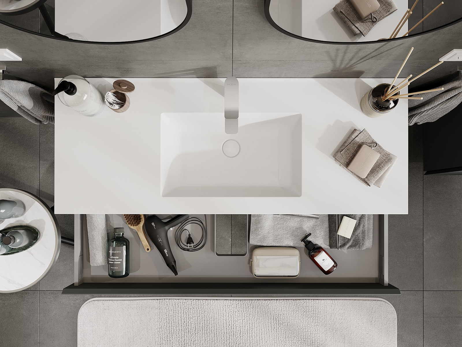 Výrez v zásuvke je navrhnutý tak, aby pojal sifón, ktorý je nevyhnutný v umývadlových inštaláciách. Vďaka tomu môže byť nábytok namontovaný plne funkčne, bez nutnosti vzdávať sa priestoru v zásuvke v prospech inštalácie.
