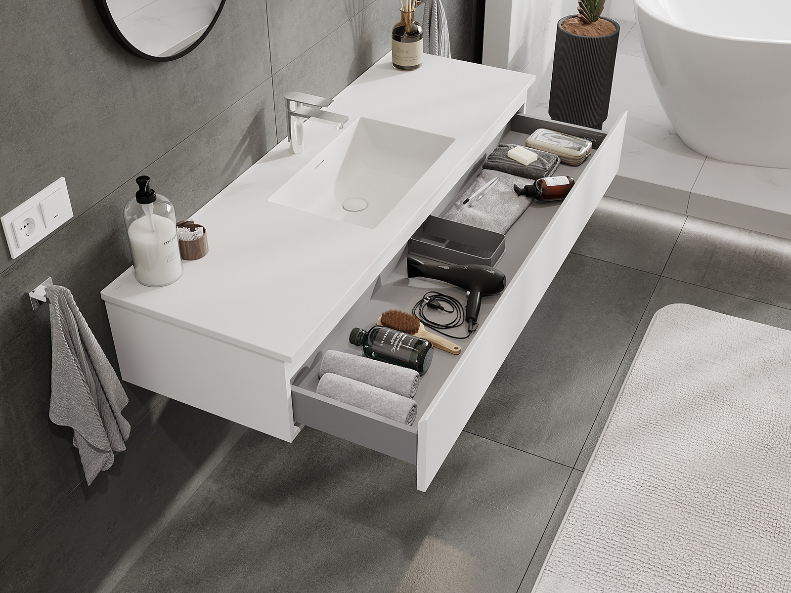 Výrez v zásuvke je navrhnutý tak, aby pojal sifón, ktorý je nevyhnutný v umývadlových inštaláciách. Vďaka tomu môže byť nábytok namontovaný plne funkčne, bez nutnosti vzdávať sa priestoru v zásuvke v prospech inštalácie.