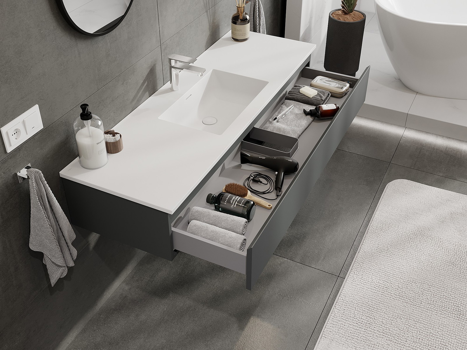 Výrez v zásuvke je navrhnutý tak, aby pojal sifón, ktorý je nevyhnutný v umývadlových inštaláciách. Vďaka tomu môže byť nábytok namontovaný plne funkčne, bez nutnosti vzdávať sa priestoru v zásuvke v prospech inštalácie.