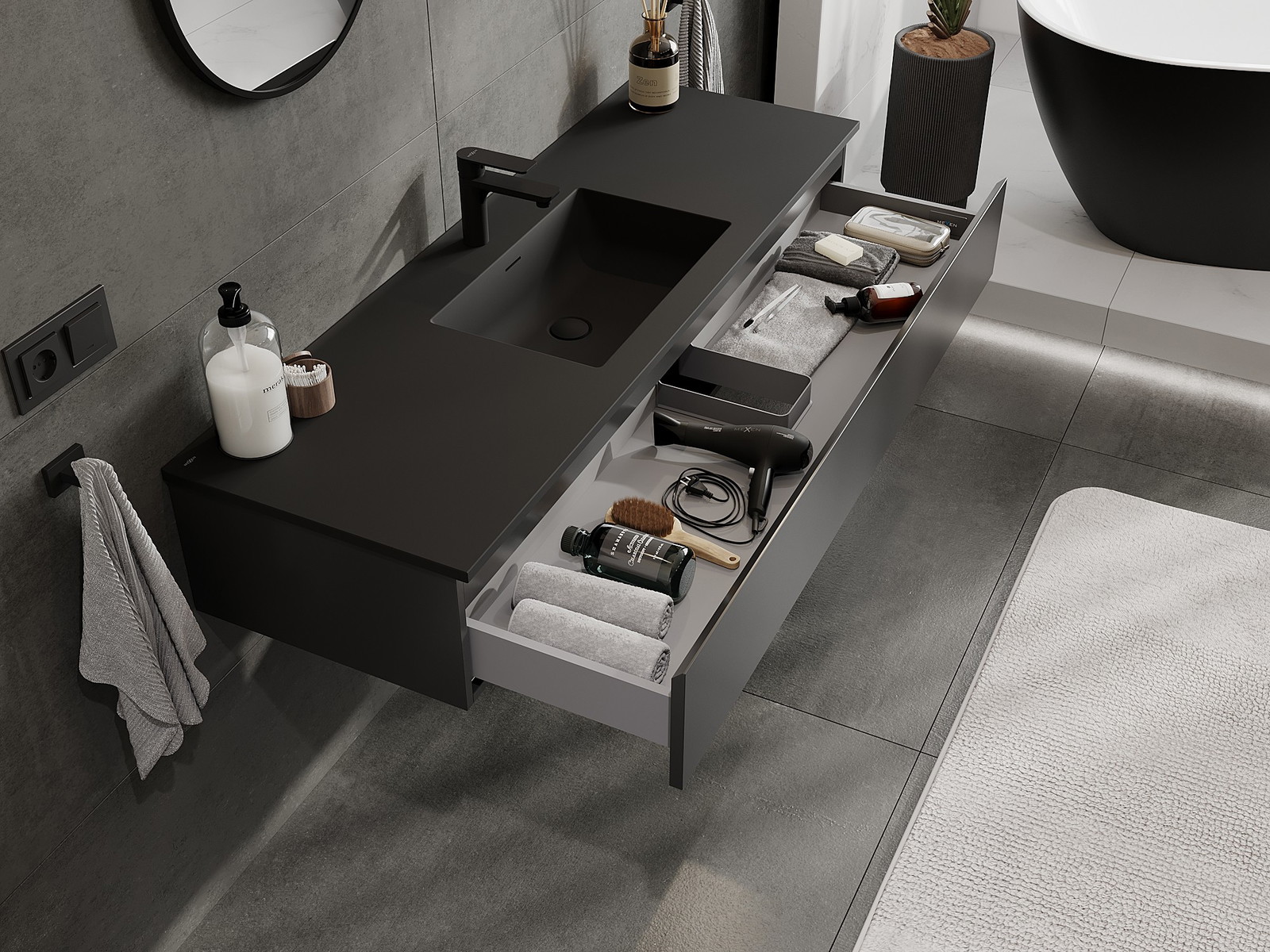 Výrez v zásuvke je navrhnutý tak, aby pojal sifón, ktorý je nevyhnutný v umývadlových inštaláciách. Vďaka tomu môže byť nábytok namontovaný plne funkčne, bez nutnosti vzdávať sa priestoru v zásuvke v prospech inštalácie.