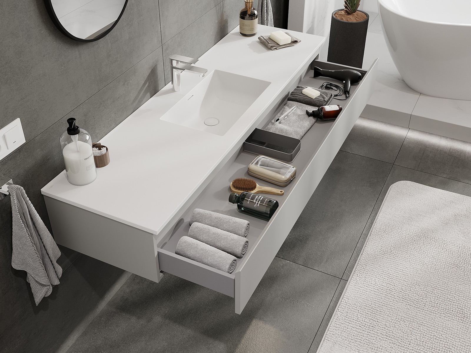 Výrez v zásuvke je navrhnutý tak, aby pojal sifón, ktorý je nevyhnutný v umývadlových inštaláciách. Vďaka tomu môže byť nábytok namontovaný plne funkčne, bez nutnosti vzdávať sa priestoru v zásuvke v prospech inštalácie.