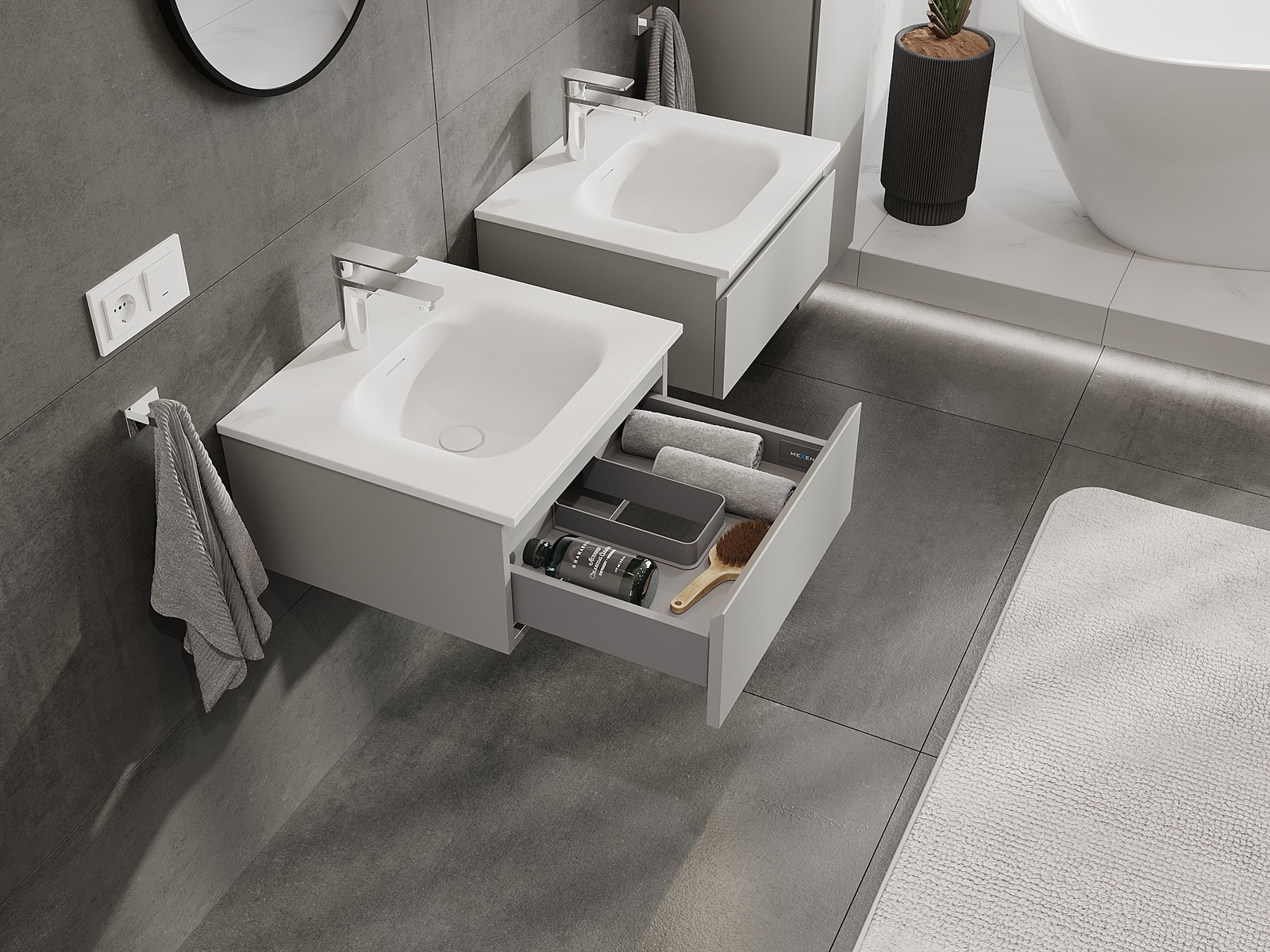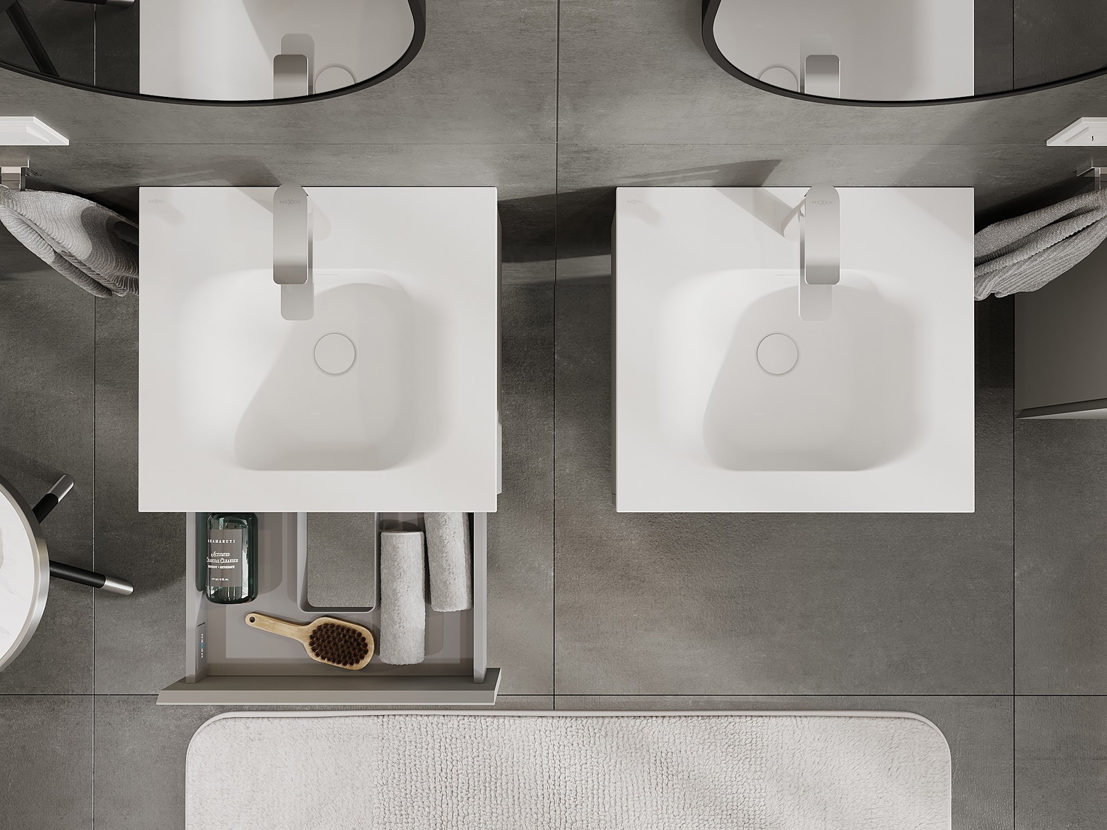 Výrez v zásuvke je navrhnutý tak, aby pojal sifón, ktorý je nevyhnutný v umývadlových inštaláciách. Vďaka tomu môže byť nábytok namontovaný plne funkčne, bez nutnosti vzdávať sa priestoru v zásuvke v prospech inštalácie.