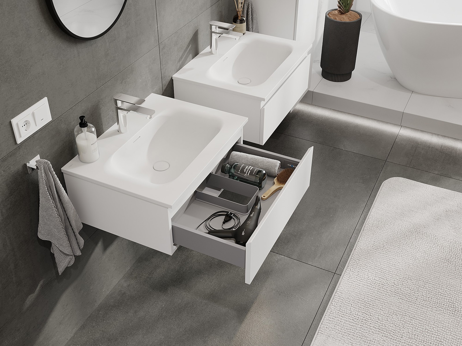 Výrez v zásuvke je navrhnutý tak, aby pojal sifón, ktorý je nevyhnutný v umývadlových inštaláciách. Vďaka tomu môže byť nábytok namontovaný plne funkčne, bez nutnosti vzdávať sa priestoru v zásuvke v prospech inštalácie.