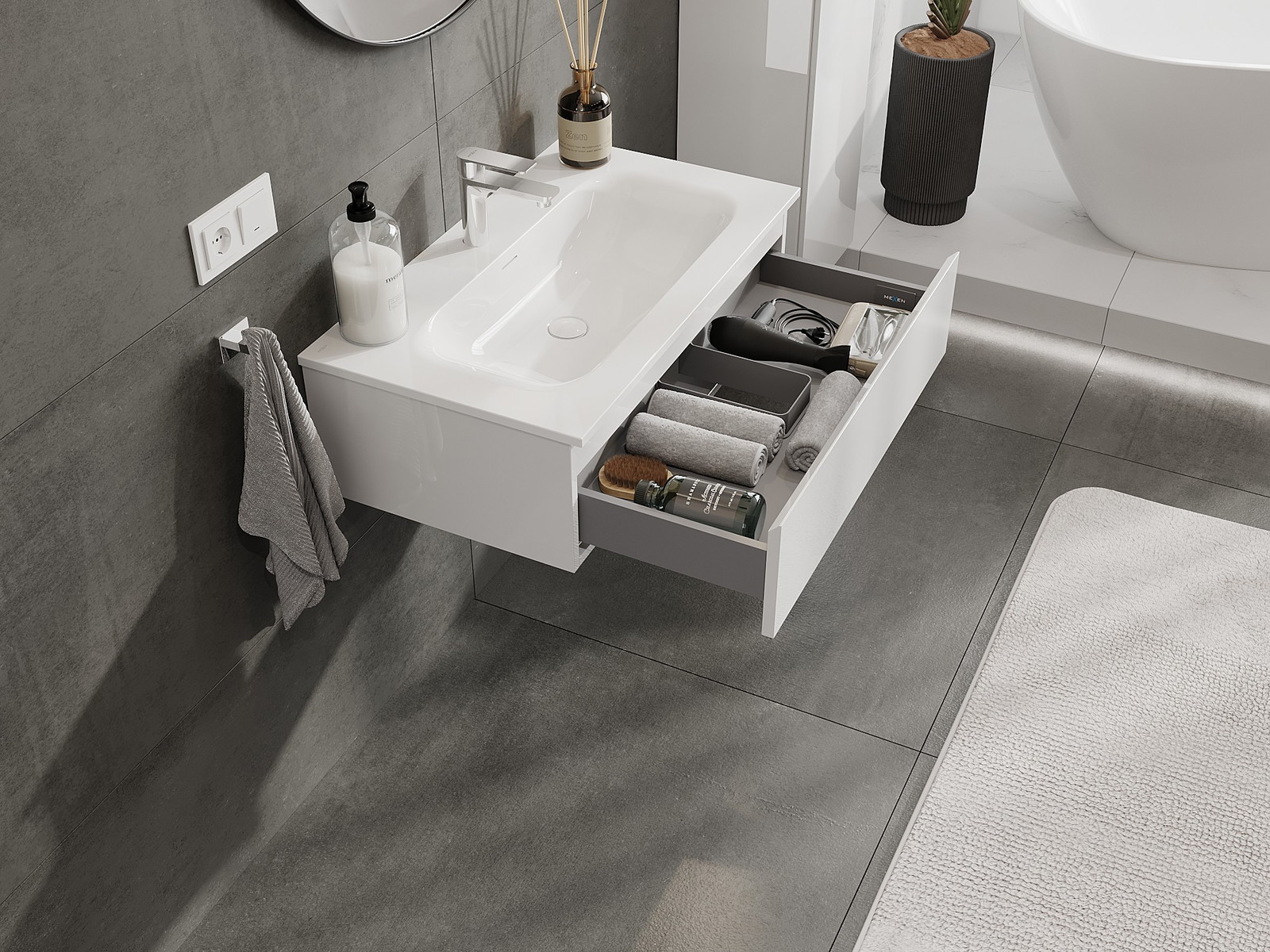 Výrez v zásuvke je navrhnutý tak, aby pojal sifón, ktorý je nevyhnutný v umývadlových inštaláciách. Vďaka tomu môže byť nábytok namontovaný plne funkčne, bez nutnosti vzdávať sa priestoru v zásuvke v prospech inštalácie.