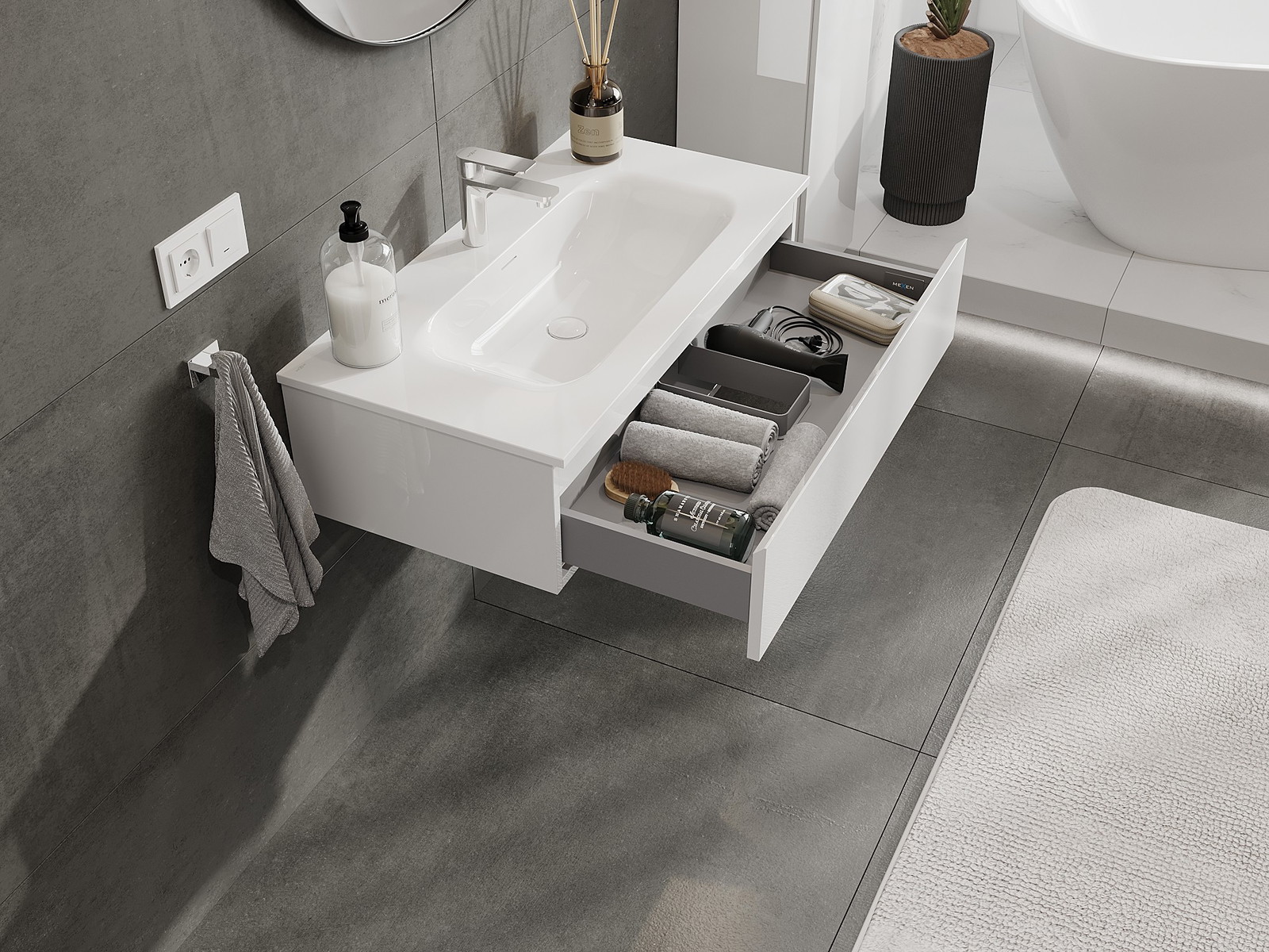 Výrez v zásuvke je navrhnutý tak, aby pojal sifón, ktorý je nevyhnutný v umývadlových inštaláciách. Vďaka tomu môže byť nábytok namontovaný plne funkčne, bez nutnosti vzdávať sa priestoru v zásuvke v prospech inštalácie.