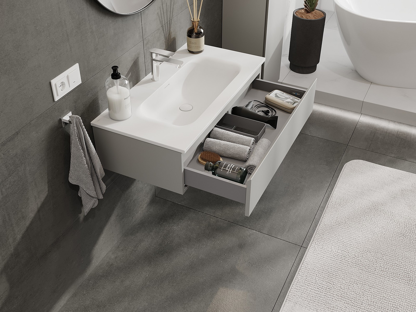 Mexen Orio kúpeľňová skrinka 90 cm s umývadlom Vela, 1 zásuvka, sivá matná/biela matná - 91A10-09023-1-BF62-W23M01